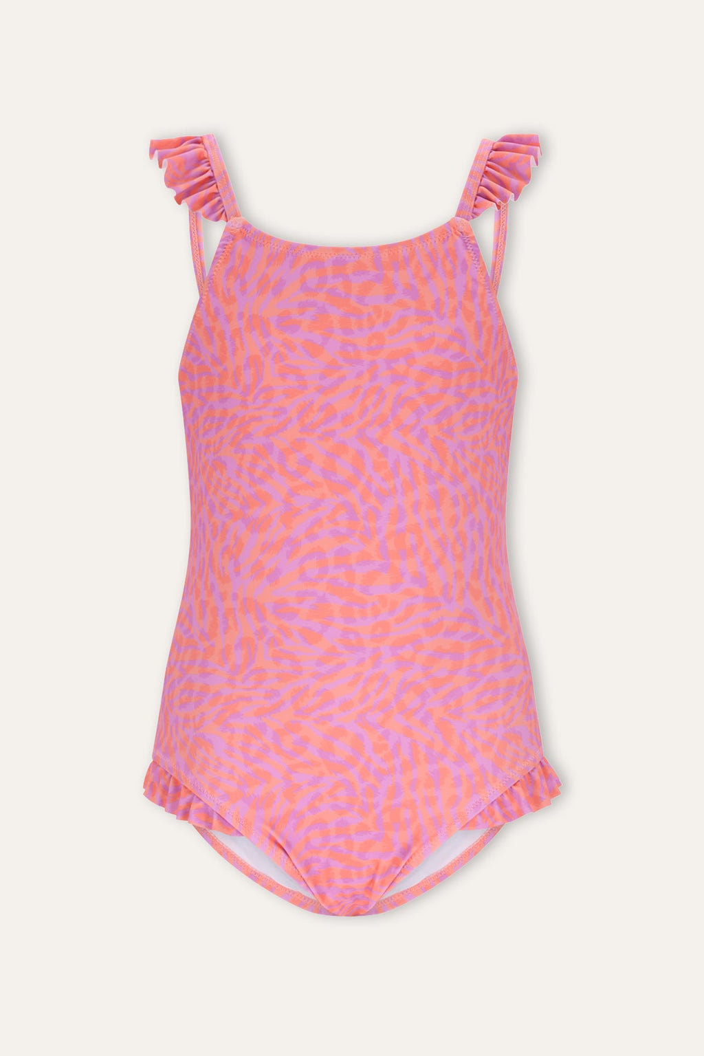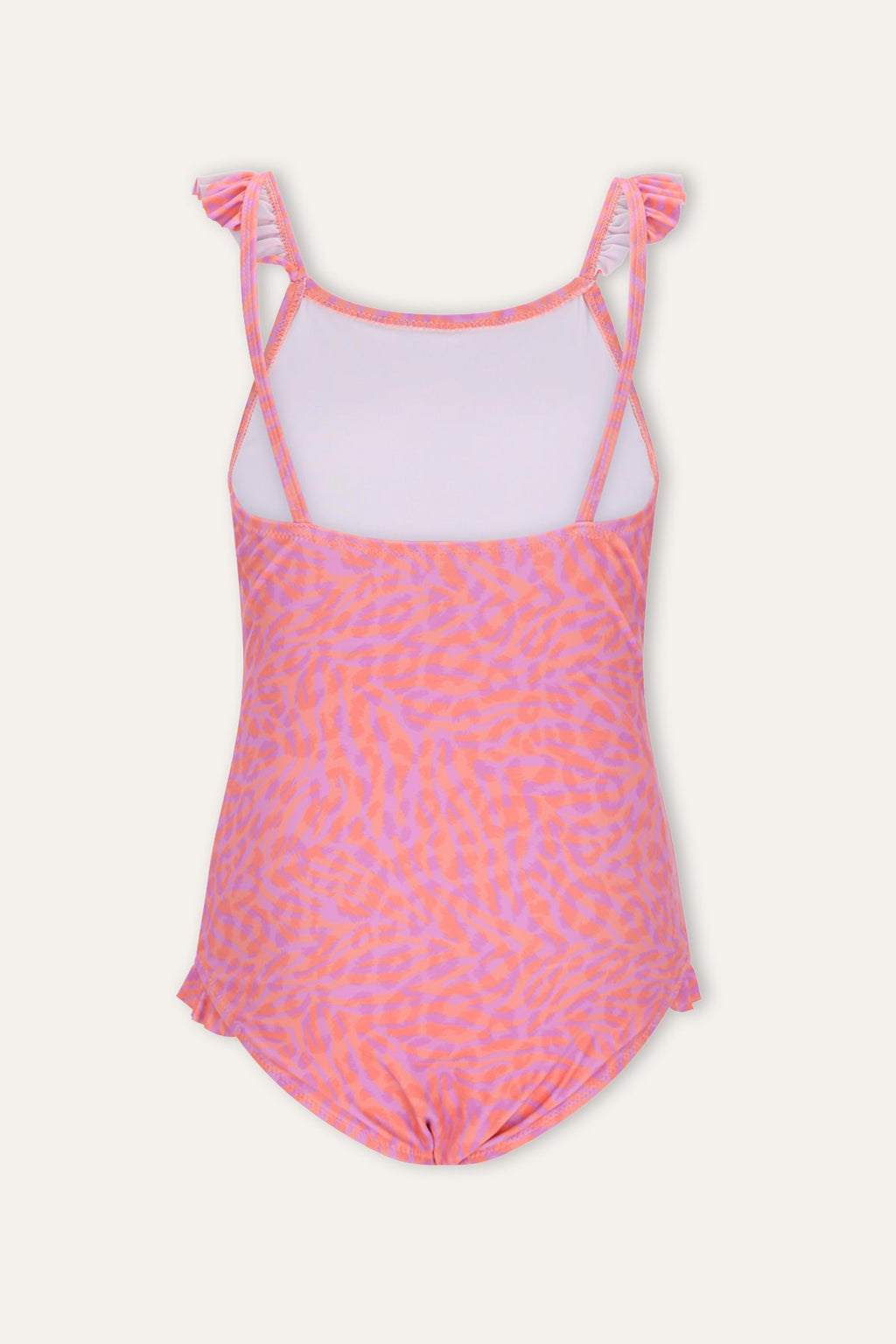 Dit vrolijke badpak maakt elke zwempartij een feestje! Gemaakt van elastische materialen, zit het heerlijk en laat jouw meid stralen. Perfect voor zonnige dagen en leuke uitjes naar het zwembad of strand. De schattige ruffles geven een speelse touch aan het ontwerp en de unieke oranje paarse zebraprint maakt het badpak extra bijzonder!• Verkrijgbaar in verschillende maten voor elke avontuurlijke meid!