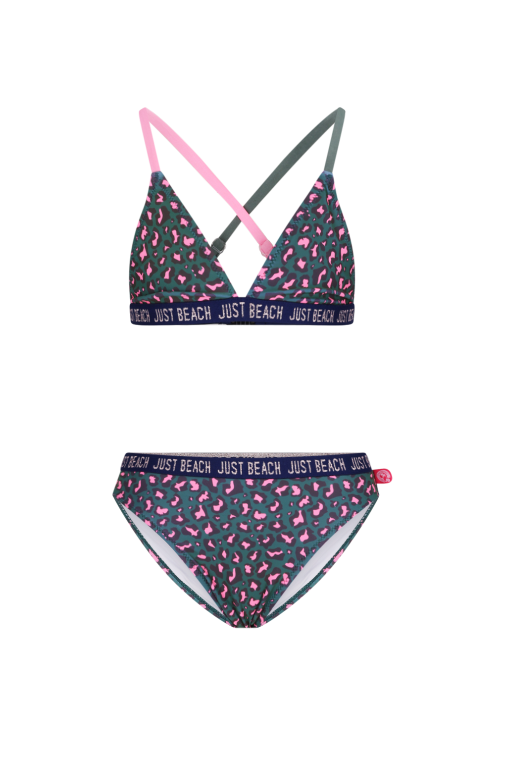 Just Beach glitter elastiek, sluiting aan de achterkant.crossback, verstelbare bandjes, bikini topje heeft padding vanaf maat 152, panterprint met roze vlekjes.