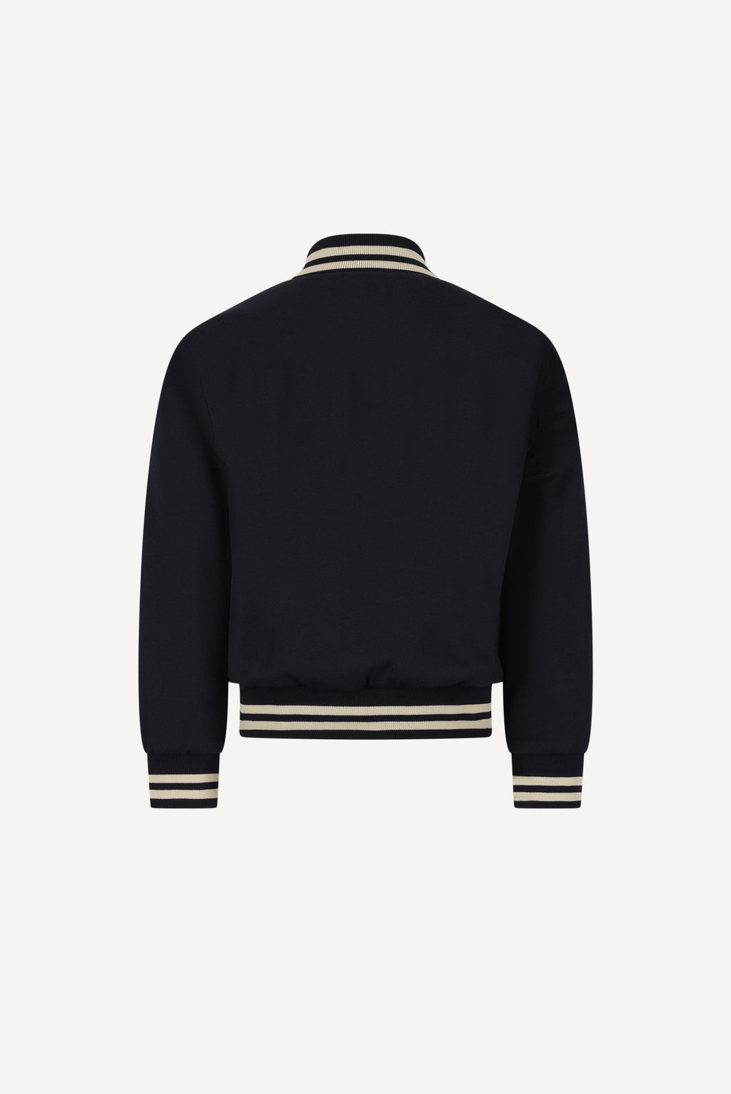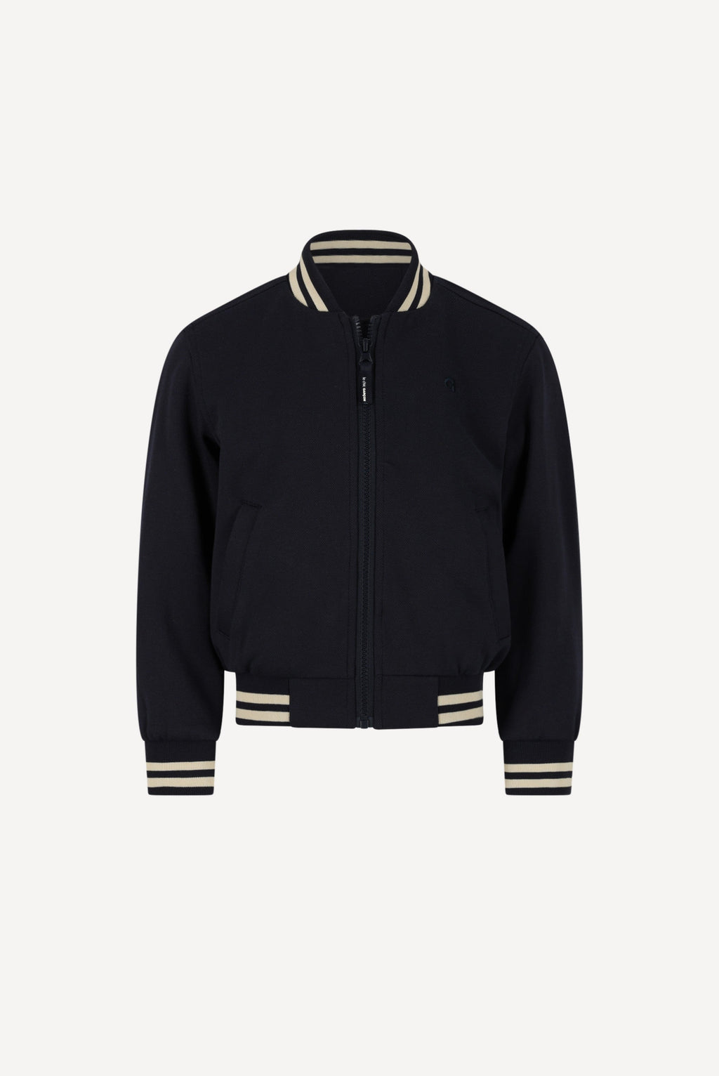 bomber in pique, gestreepte rib manchetten en kraag. Stoer en cool, tijdloos