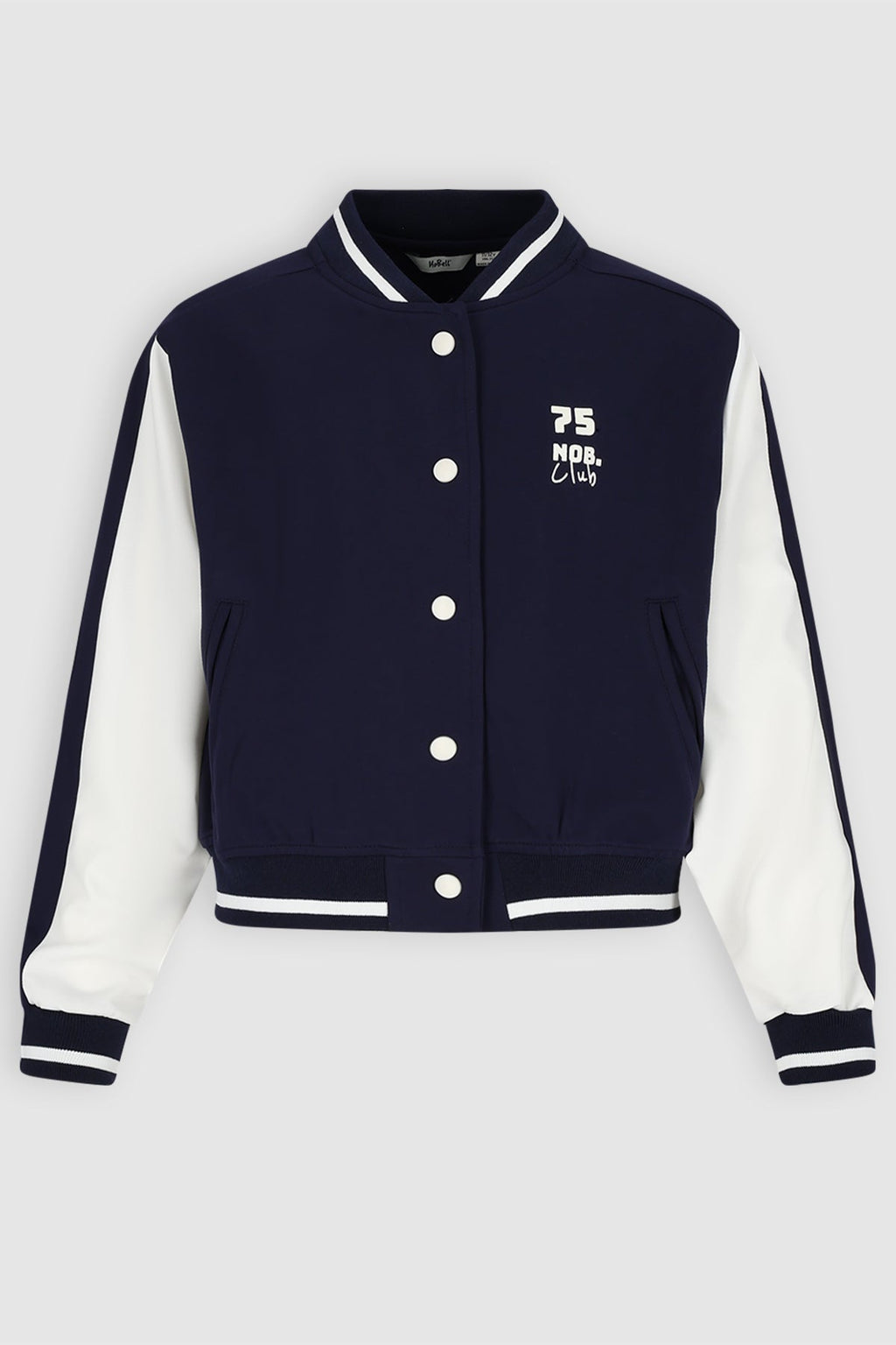 Maak je tienergarderobe compleet met deze stoere donkerblauwe college jas van Nobell'. Een absolute eyecatcher dankzij de grote 75 print op de rug en de praktische drukknopen. Deze jas geeft elke casual look een trendy statement en laat tienermeiden stralen. Voel je onafhankelijk en stijlvol in deze unieke jas.