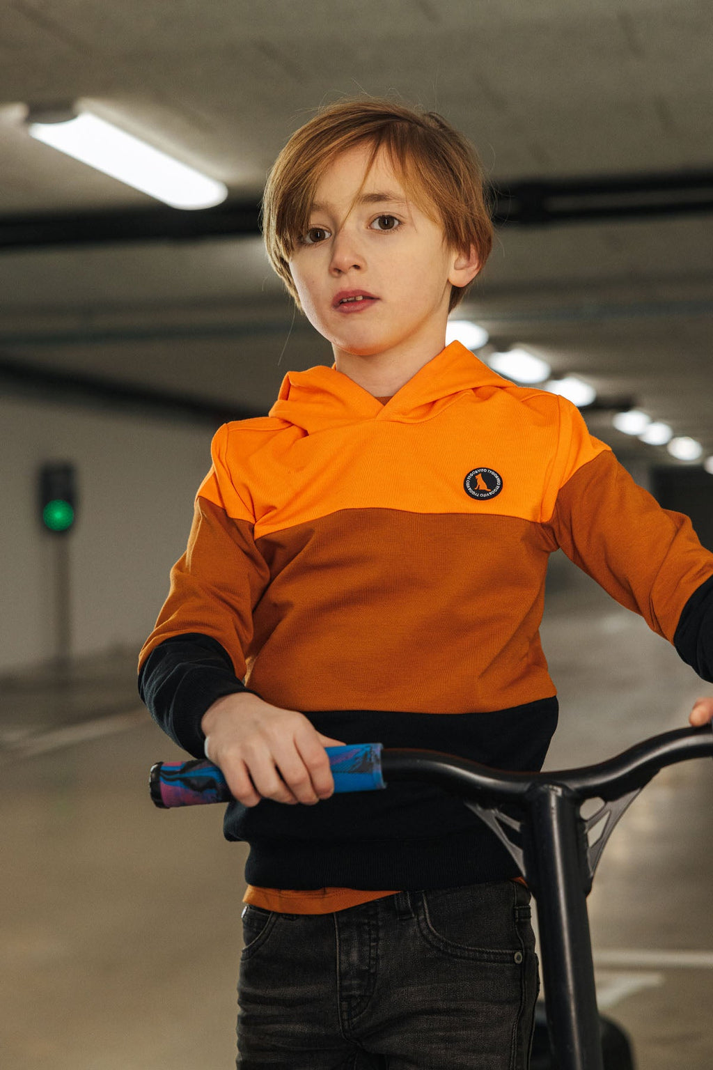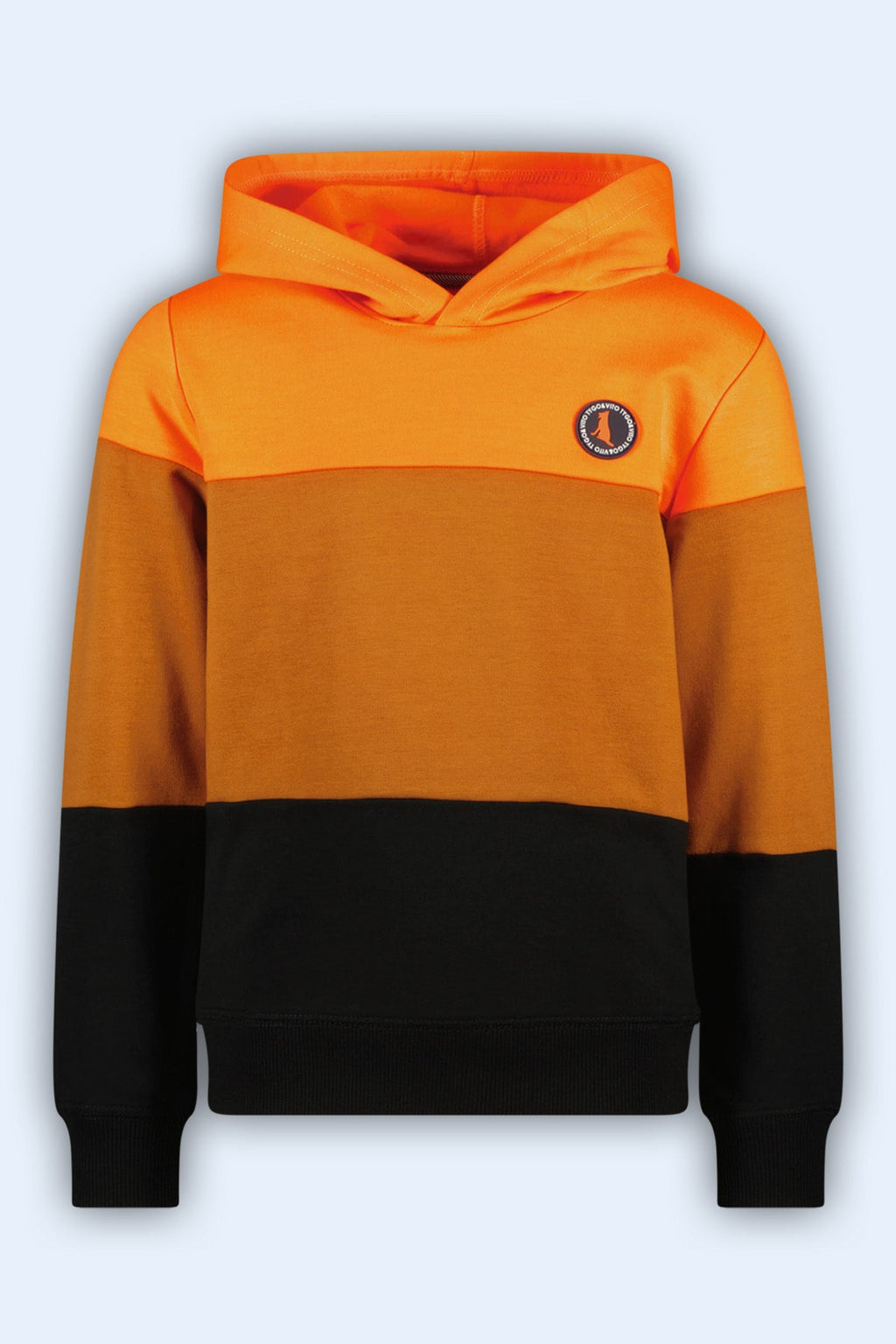 Stoere drie kleurige colorblock jongens hoodie van TYGO & vito in neon oranje, bruin en zwart met leuke badge. Deze zachte sweater is leuk te combineren op de joggingbroeken Bas en Boet. Gemaakt in een mix van biologisch stretch katoen en recycled polyester. De hoodie is verkrijgbaar in de maten 92-152. TYGO & vito for a better nexterday!