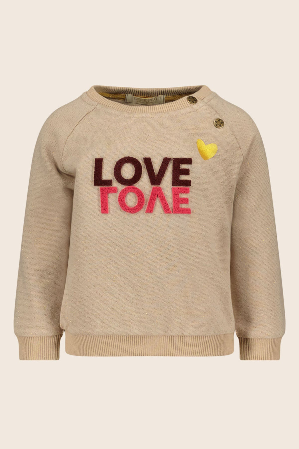 Onze Like Flo trui GIGI is perfect voor de winter! Deze grijze melee trui met subtiele lurex glitters is heerlijk warm en heeft net dat beetje extra voor de feestelijke dagen. Het roze 'LOVE' artwork met een goud hartje geeft een stoer accent. Dankzij de schouderknoopjes met logo is de trui makkelijk aan en uit te trekken. Combineer GIGI met het rokje LILLY en de roze coltrui KIKI voor een comfortabele en trendy winteroutfit. Een fijne trui die zowel stoer als makkelijk te dragen is.