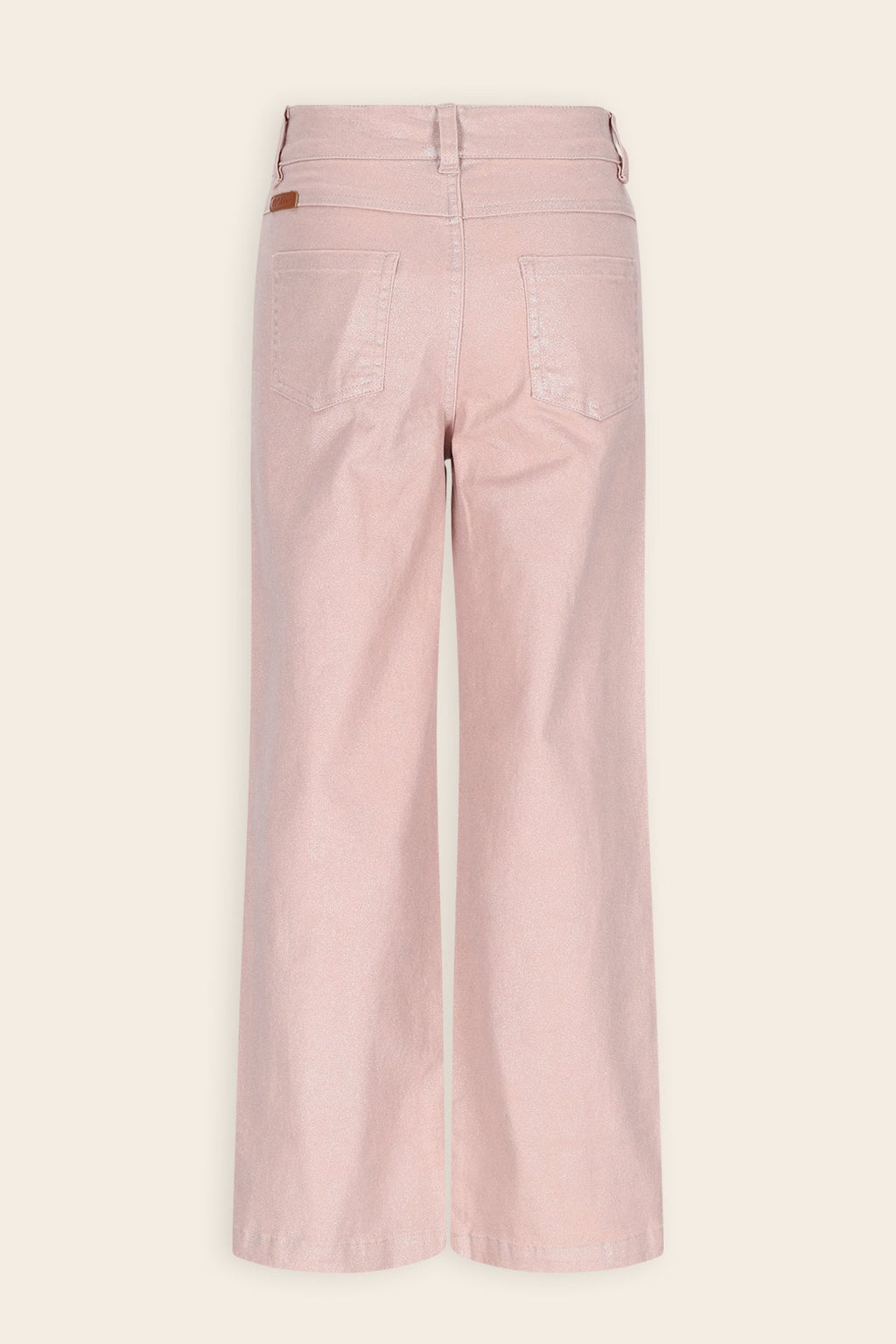 twill lange 5 pocket broek met wijde pijpen. De stof heeft een mooie silveren glimmende coating voor de special look