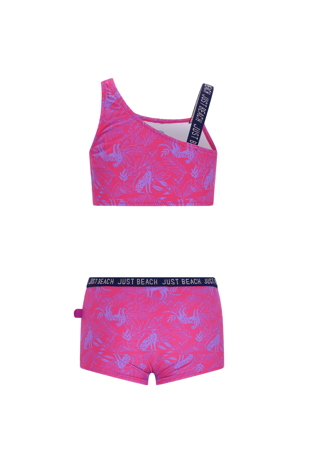 De Just Beach Tanzania bikini in paars is een echte blikvanger en perfect voor een vrolijke dag op het strand of bij het zwembad! Deze trendy bikini is speciaal ontworpen voor meiden en combineert comfort met een hippe, vrolijke en trendy stijl. Het unieke one-shoulder effect geeft de bikini een speelse en modieuze touch, terwijl het Just Beach glitter elastiek bij de schouder en het broekje zorgt voor een extra feestelijk detail. Het broekje heeft korte pijpjes, wat zorgt voor extra comfort en bewegingsvrijheid. De tropische ton sur ton print met cheetahs en bladeren maakt deze bikini helemaal af en zorgt voor een opvallende stijl. Deze bikini is goed te combineren met andere items uit de Just Beach collectie om een complete strandoutfit te creëren.