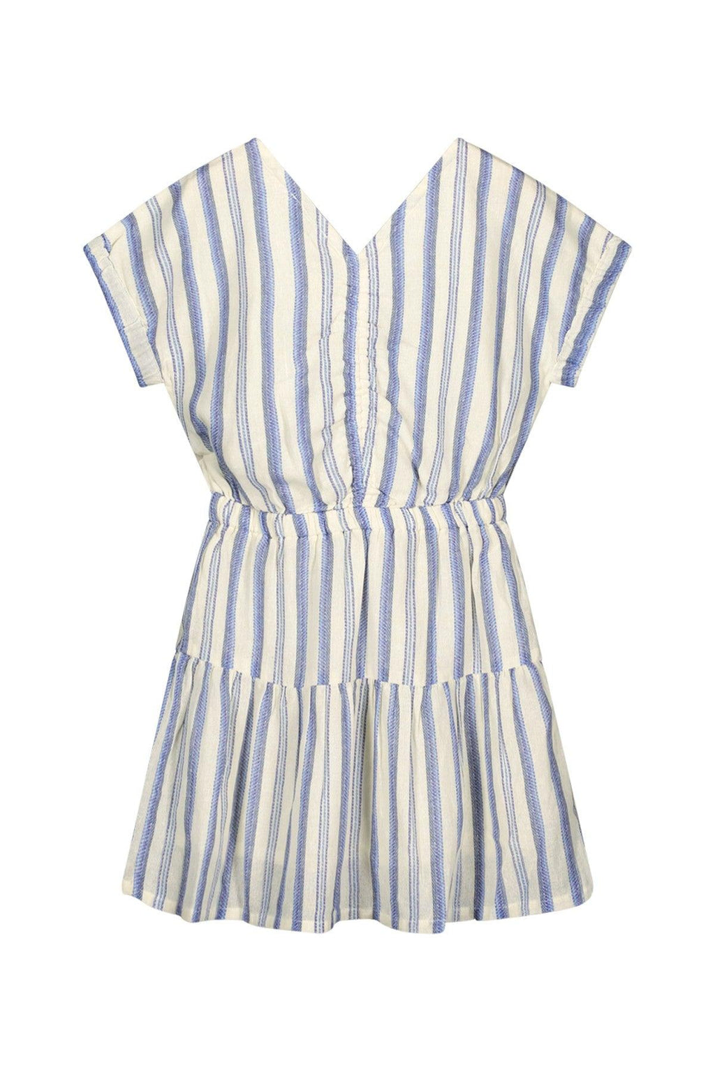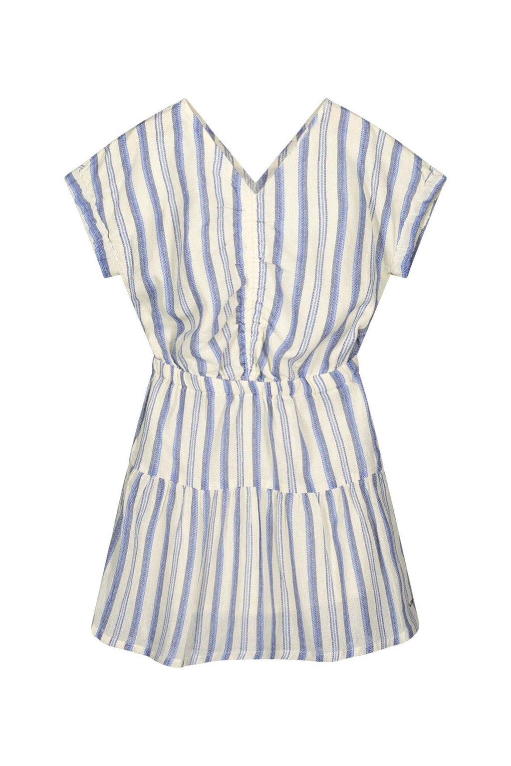 Heerlijk geweven linnen-look jurkje met blauw-witte strepen met een mooi motiefje.