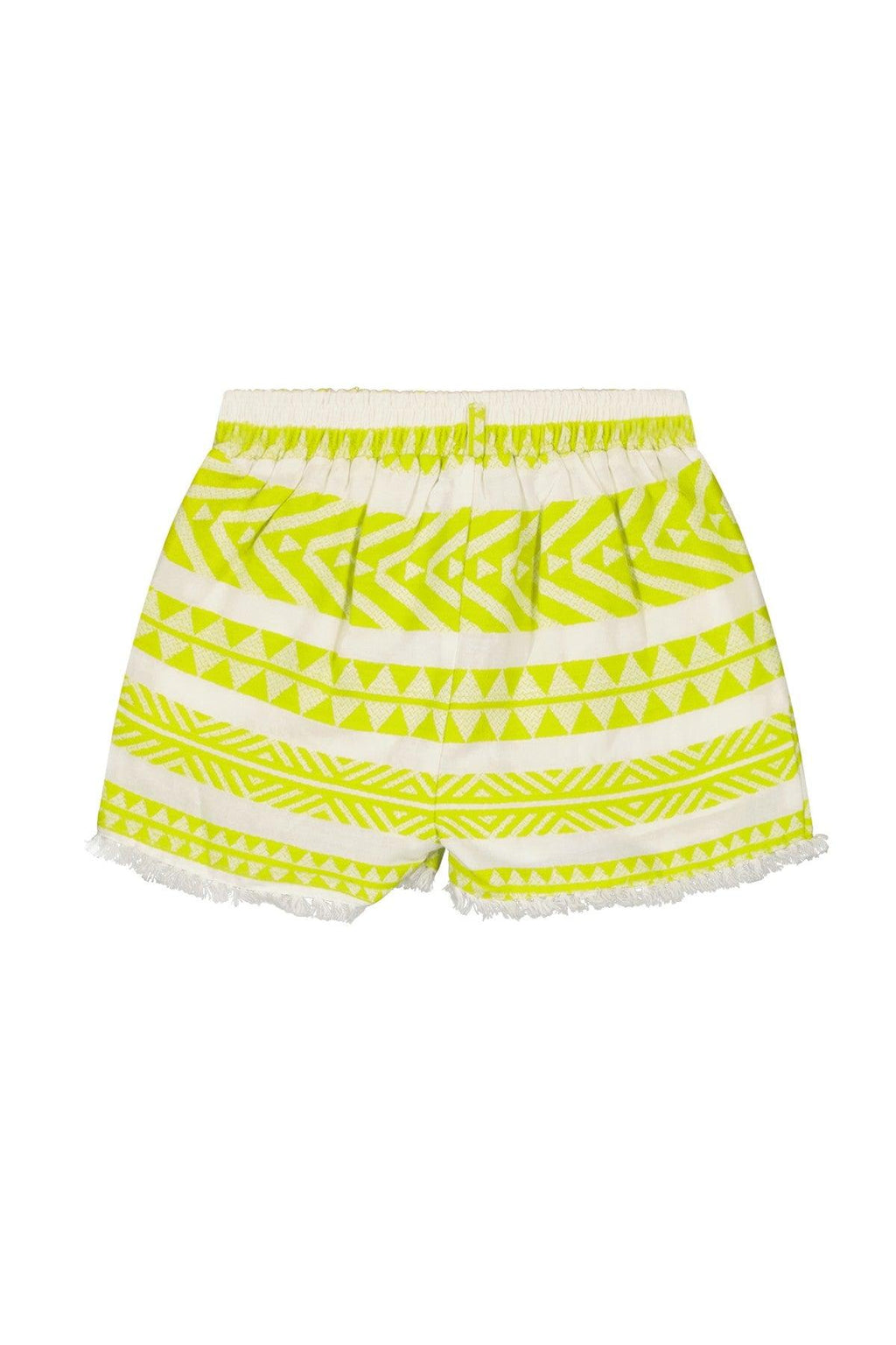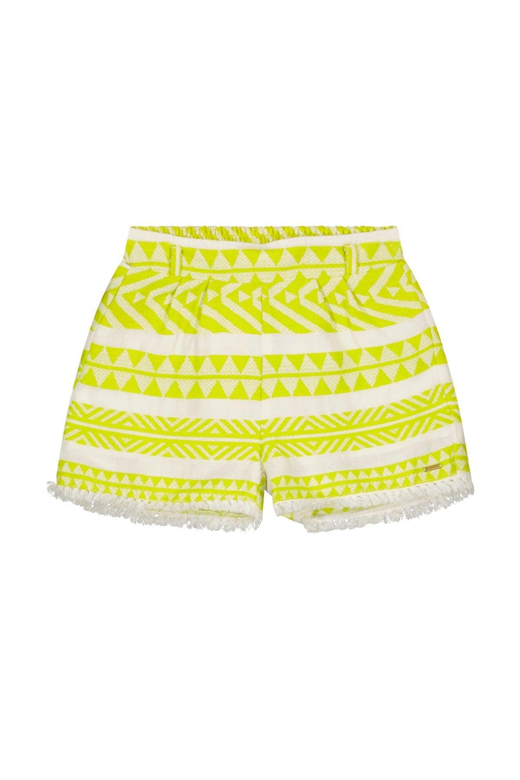 Luna fancy Shorts BALI Lime. Deze lime kleur is echt waanzinnig. Mooi geweven Shortsje in grafisch patroon van Lime en Off White. Combineer hem met een witte tee en style af met de matching knoop top. Luna's favourite.