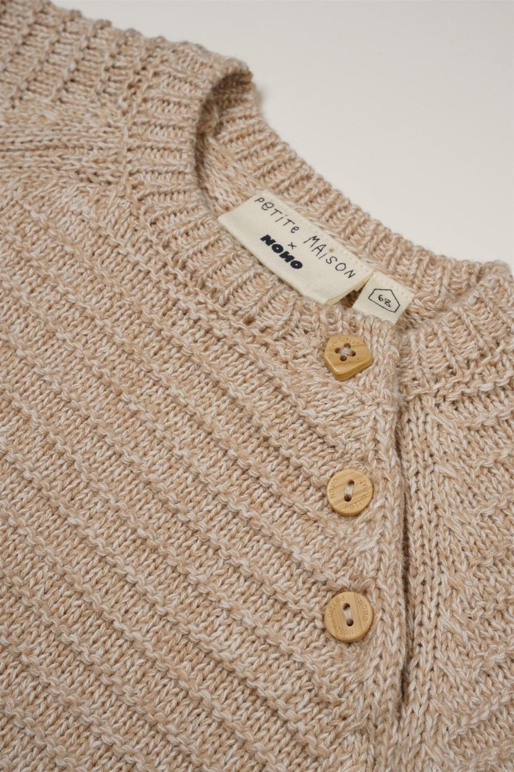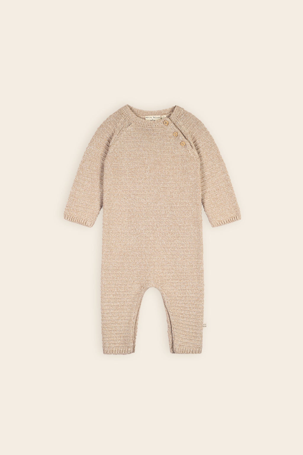 Bequemer Strickanzug, der sich sowohl sehen lassen kann als auch so bequem ist, dass Ihr Baby darin wunderbar schlafen und spielen kann. Erhältlich in Melange-Haferflocken und Melange-Rosa