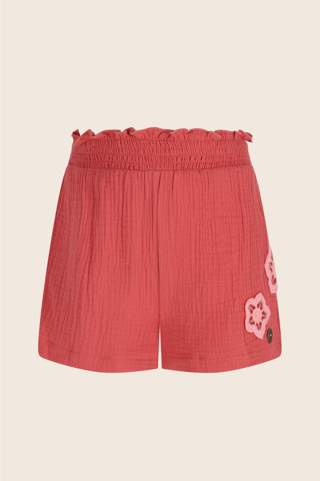 Soepelvallend shortje met comfortabele elastische tailleband. Leuke crochet bloemen op de zijkant van het broekje.