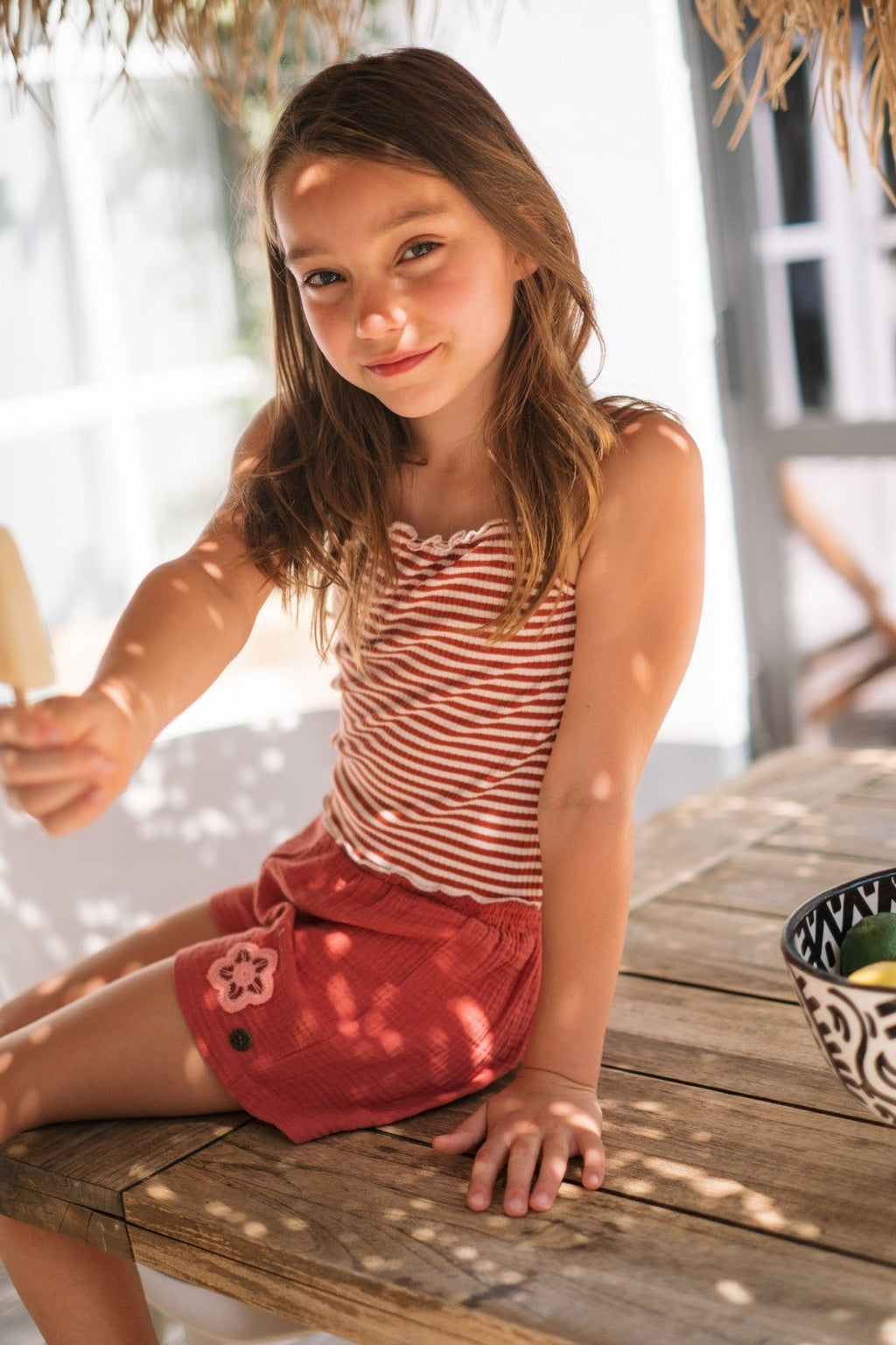 De Fee shorts van Like Flo in een trendy roestkleur is perfect voor elke gelegenheid. Gemaakt van katoen zorgt deze shorts voor een comfortabele fit. De elastische tailleband biedt een ideale pasvorm, terwijl de leuke crochet bloemen aan de zijkant een speelse twist geven. Combineer dit shortje met de bijpassende top Cecile voor een complete outfit.