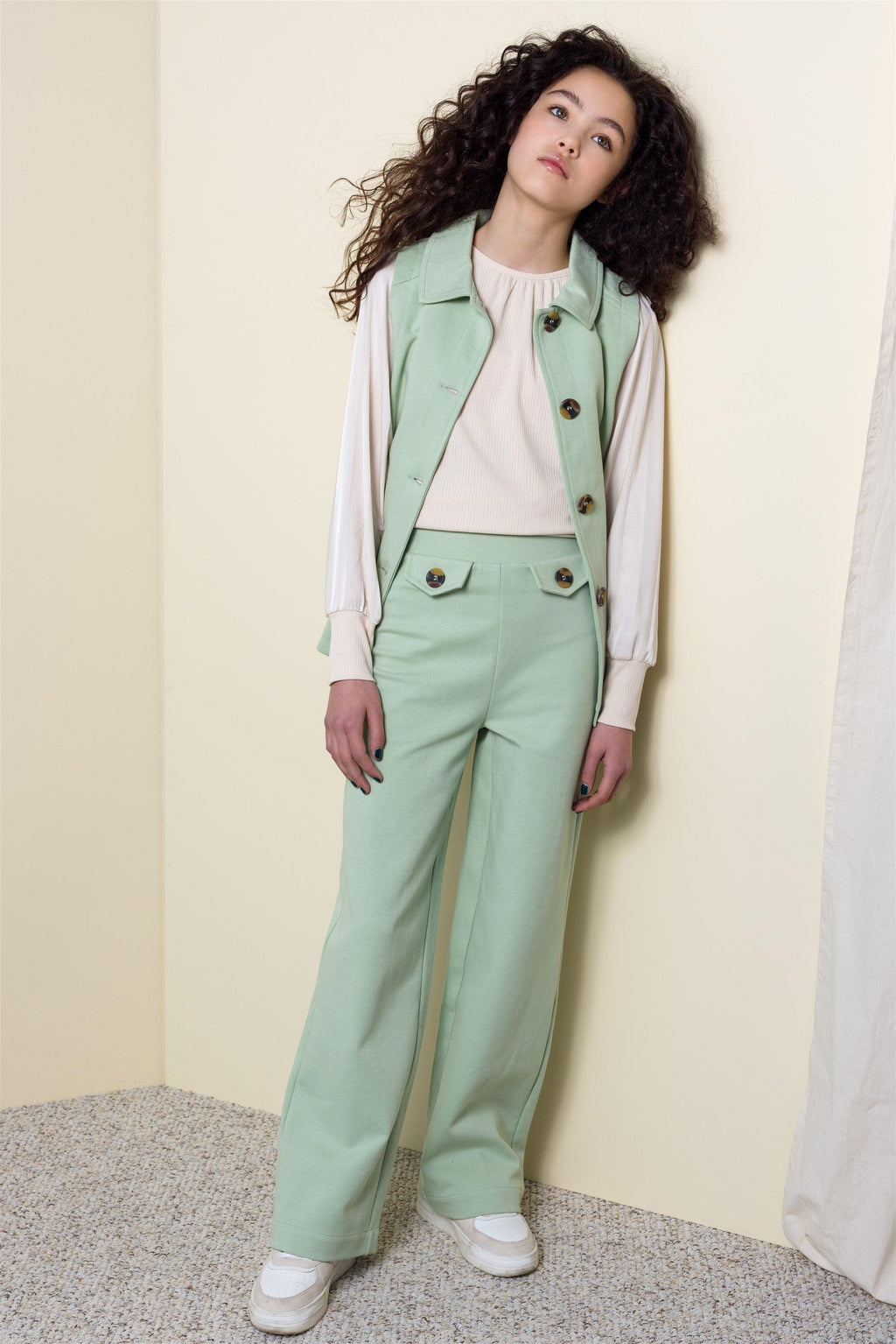 Heerlijk zittende pique jersey broek van stevige kwaliteit met wijde pijpen en hoge tailleband. Style deze broek af met gilette Tika