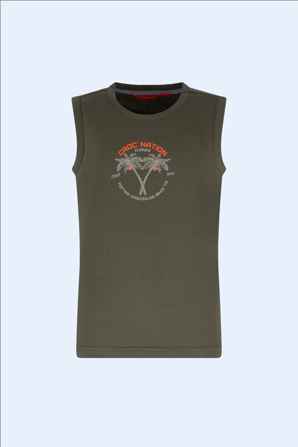 Dit olijfgroene T-shirt van TYGO & vito is een super toevoeging aan de kledingkast van jouw jongen. Gemaakt van 100% biologisch katoen en GOTS gecertificeerd, voelt dit shirt heerlijk zacht aan en is het een goede keuze voor hem en de planeet. De zomerse print maakt dit mouwloze shirt helemaal af en zorgt voor een gave, casual look.