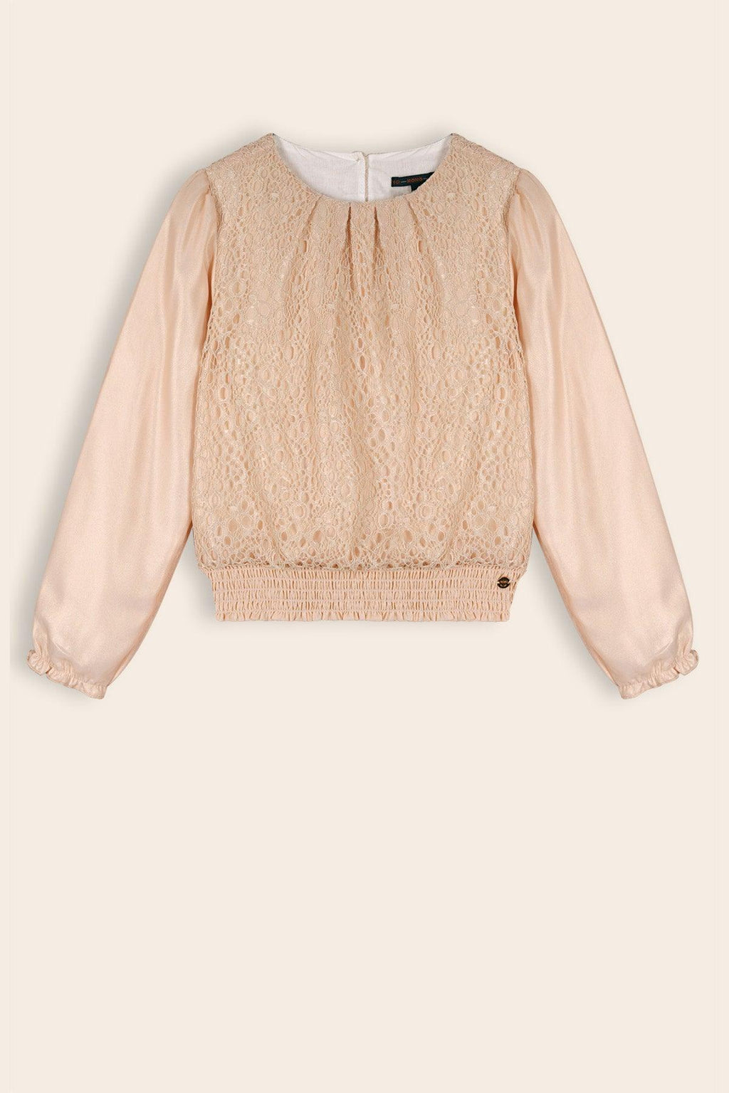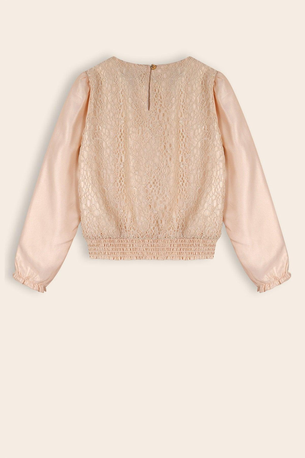 Feestelijke blouse voor speciale gelegenheden zoals kerst, een bruiloft of communie. Gemaakt van fijn kant met voile mouwen. De mouwen zijn gevoerd met een dunne katoenen voering. Combineer dit blousje stoer op de witte broek Sayla.