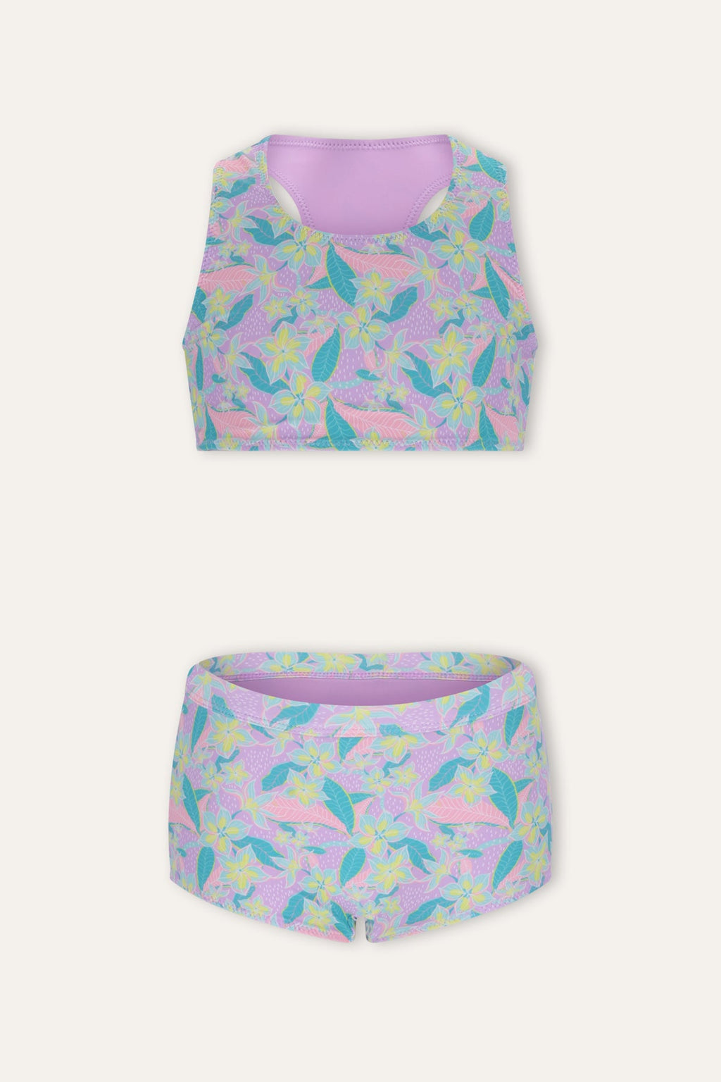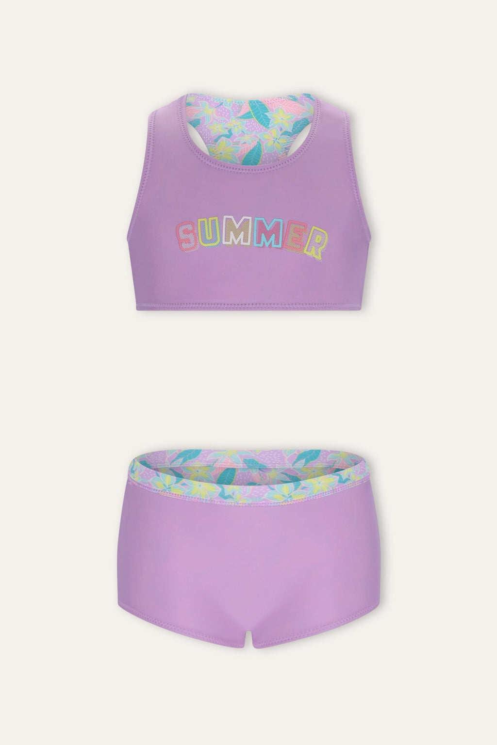 • Deze bikini is omkeerbaar met een effen lila kant en een bloemenprint in pastelkleuren.