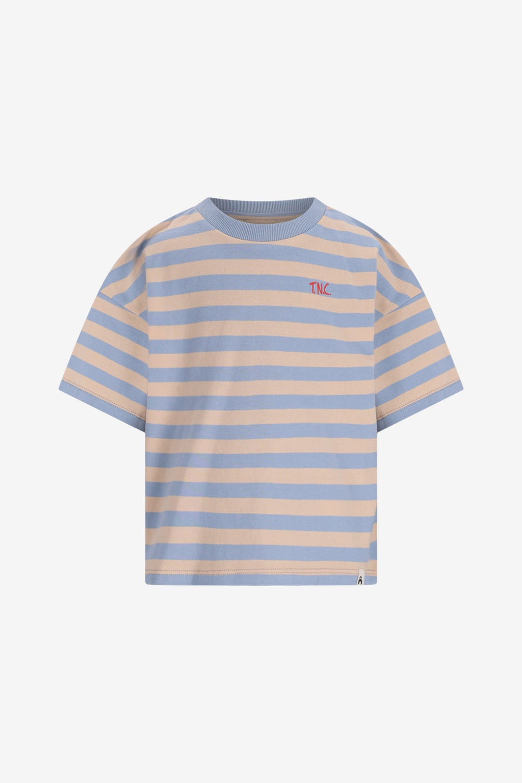Playful and timeless! This T-shirt has blue and beige stripes, giving it a fresh look. The round neck and soft fabric make it a comfortable choice for everyday wear.