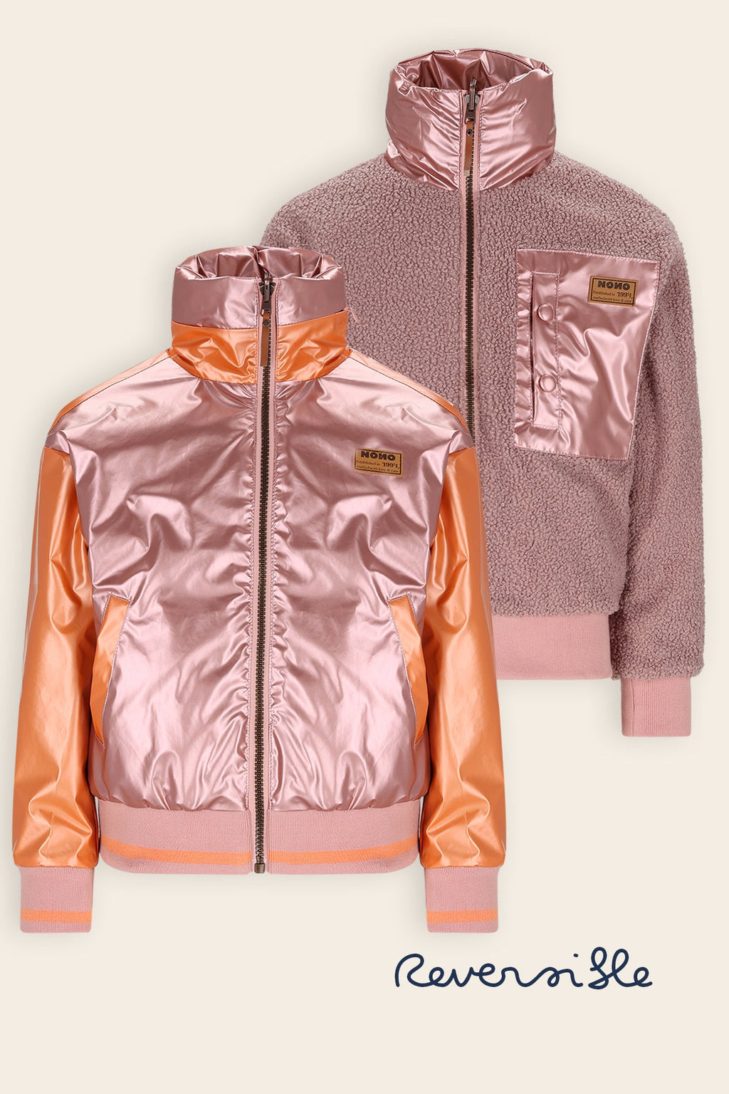 Omkeerbare zomerjas van NONO in een vrolijke oranje kleur. Deze jas is gemaakt van 100% recycled polyester en is een must-have voor creatieve meiden die hun eigen identiteit willen uitdragen. De jas is aan twee kanten te dragen, met een metallic zijde en een zachte teddy zijde. Dit speelse design is makkelijk te combineren en voegt direct flair toe aan elke outfit.