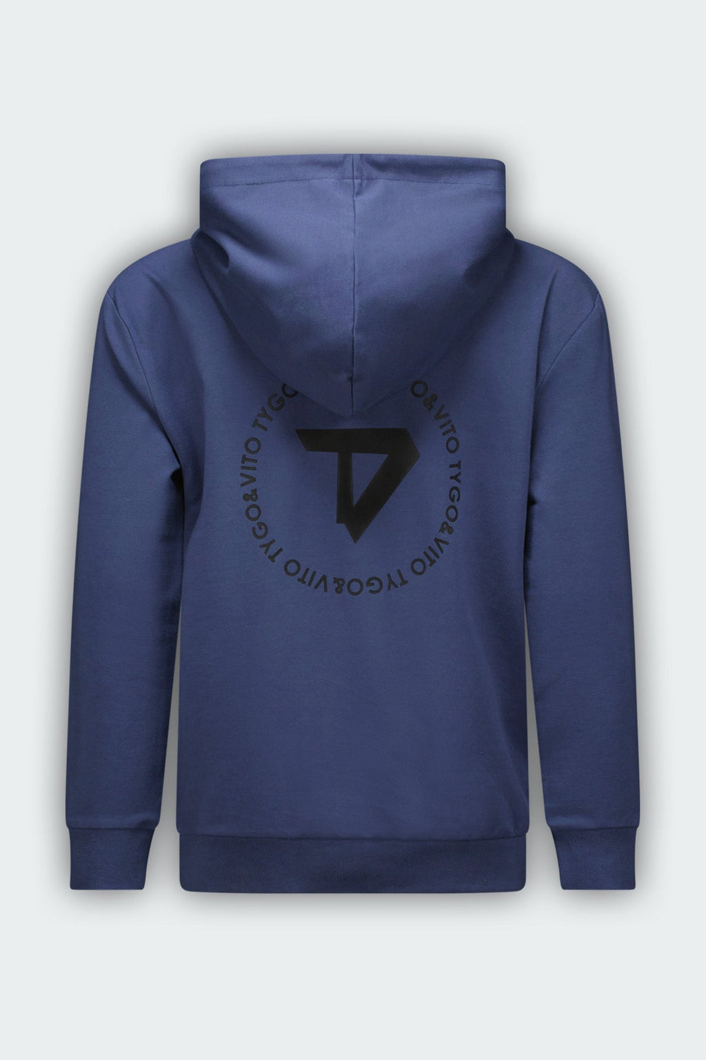 Hoe stoer is deze blauwe hoodie Damian van TYGO & vito teens met logo badge op de borst en 1 kleurige print op de rug? Zakjes met ritsen als leuk detail! Wil je een compleet joggingpak maken, combineer deze trui dan met de Jogpants Jake. Verkrijgbaar in de maten 128-188. TYGO & vito