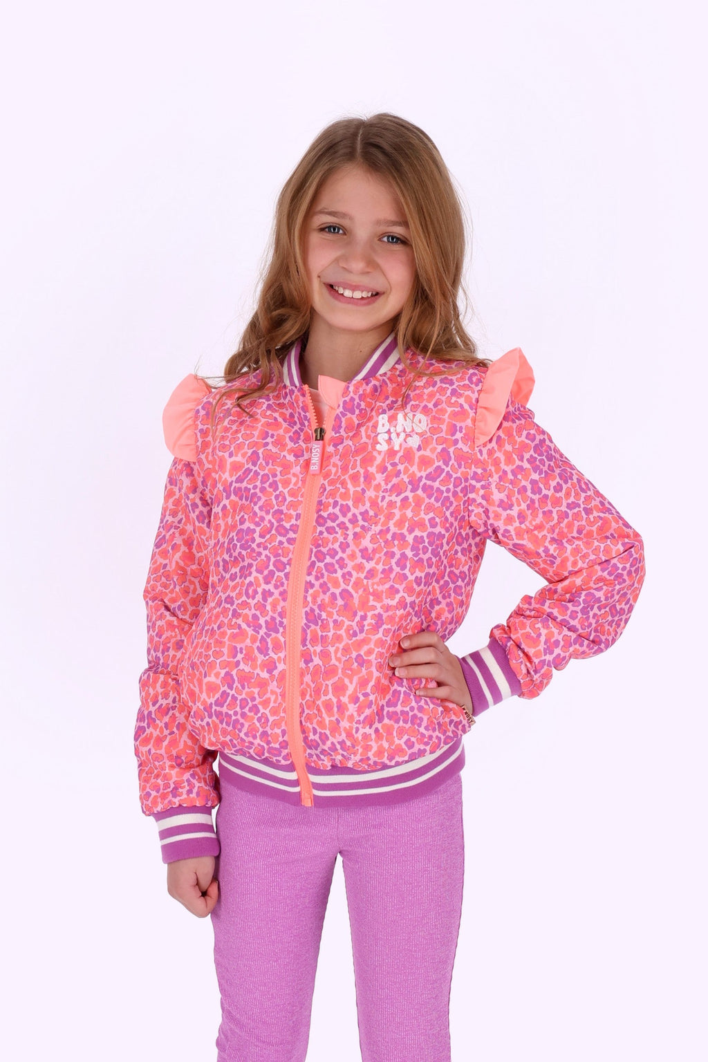 De Juna bomber in een vrolijke oranje paarse panterprint is het perfecte jasje voor elke petit fashionista! Dit jasje met ruffles en ribboorden is zowel stylish als comfortabel. Een must-have voor iedere speelse garderobe!• Maatvoering: 98 t/m 164.