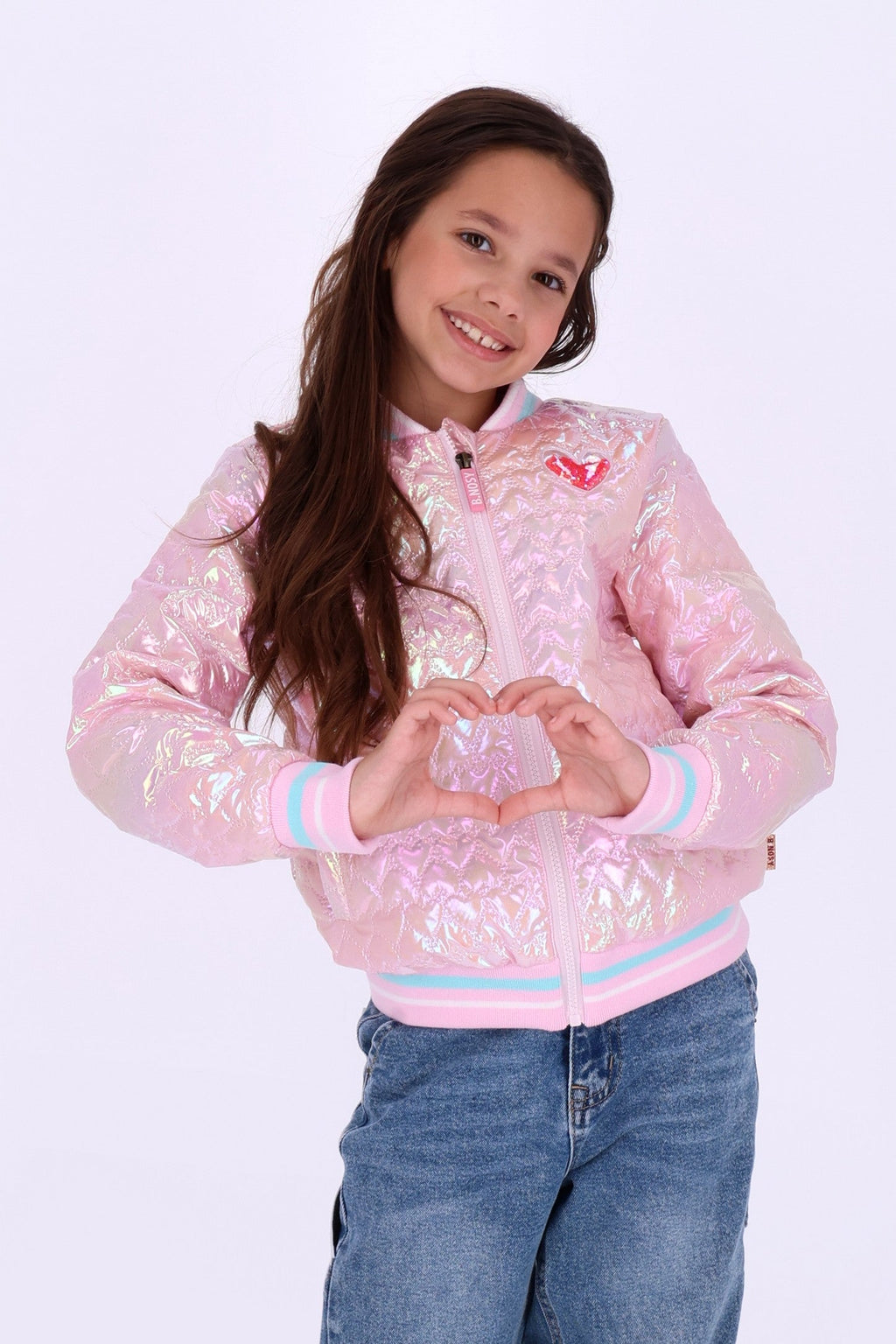 Maak het elke dag bijzonder met dit vrolijke B.Nosy Juna Bomber jasje! Dit jasje is ideaal voor stoere meiden die graag willen stralen. Met het shiny effect en de schattige hartjes stepping geef je elke outfit een leuke twist. Dit jasje is perfect in combinatie met jouw favoriete B.Nosy outfit!