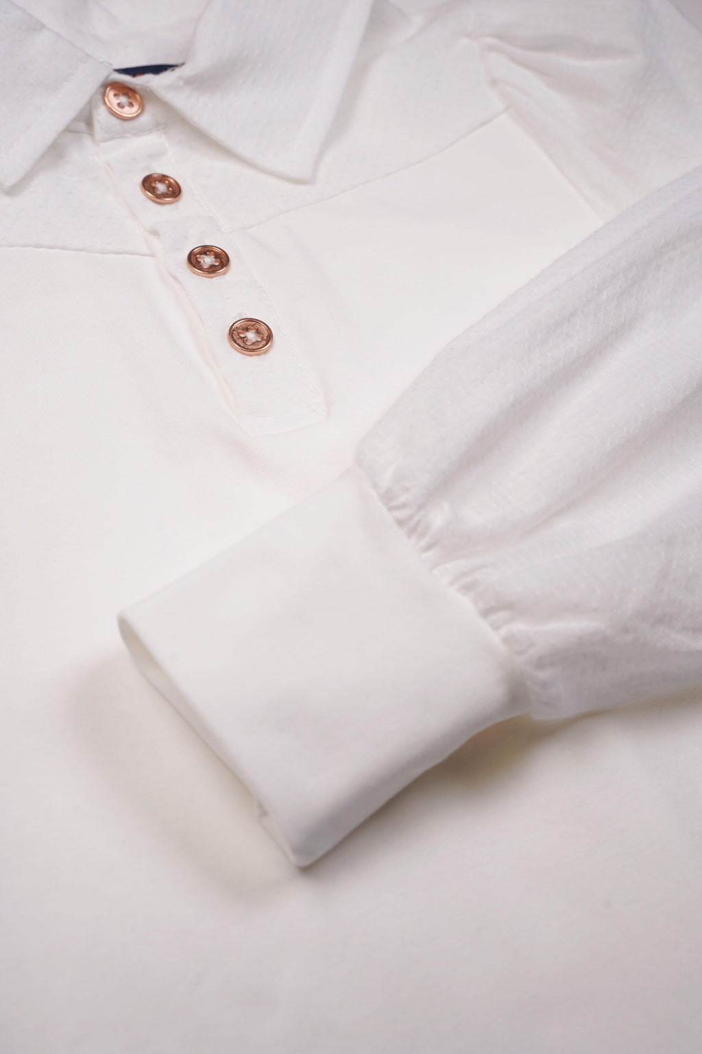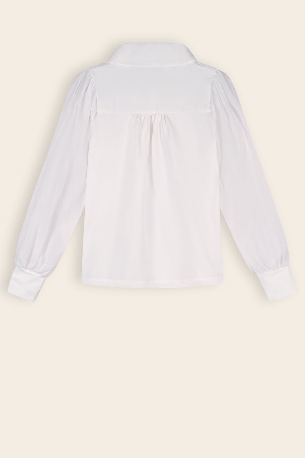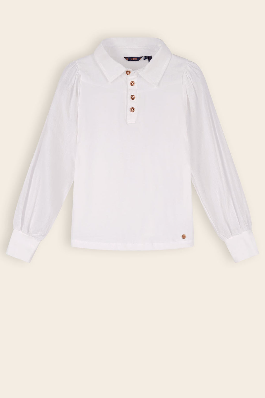 Top met geweven lange mouwen en kraag. Body gemaakt van biologisch kantoenen jersey en dus super comfortabel. Ideaal om onder spencer Kency te dragen.