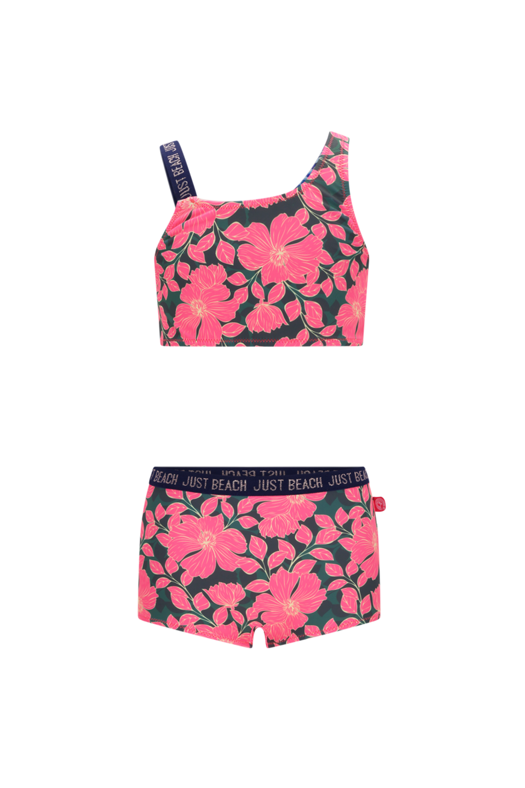 Deze hippe en vrolijke Just Beach bikini in roze met de Flower Jungle print is perfect voor stoere meiden! Het trendy one-shoulder design en de glitter elastiekjes maken dit een echte blikvanger. Het broekje heeft leuke korte pijpjes wat zorgt voor extra comfort tijdens het spelen.