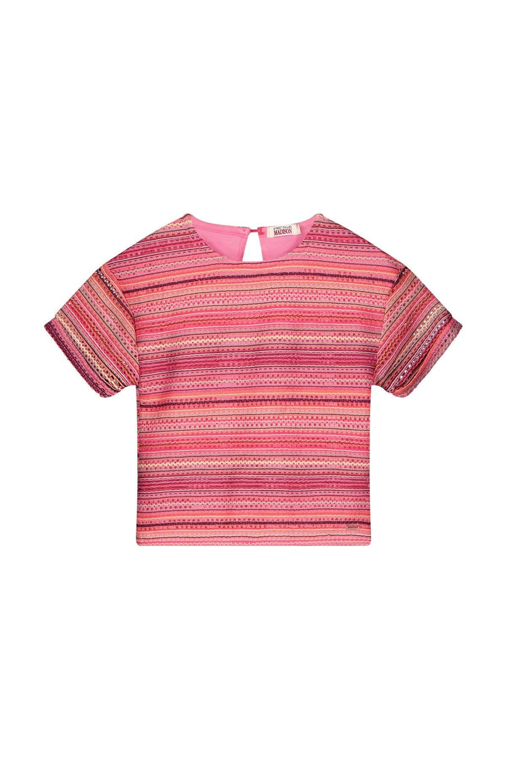 Luna fancy knit top CAMILLE. Multi colour roze gehaakte top met zachte voering. wist je dat we een matching Shortsje en phone bag hebben van dezelfde stof?