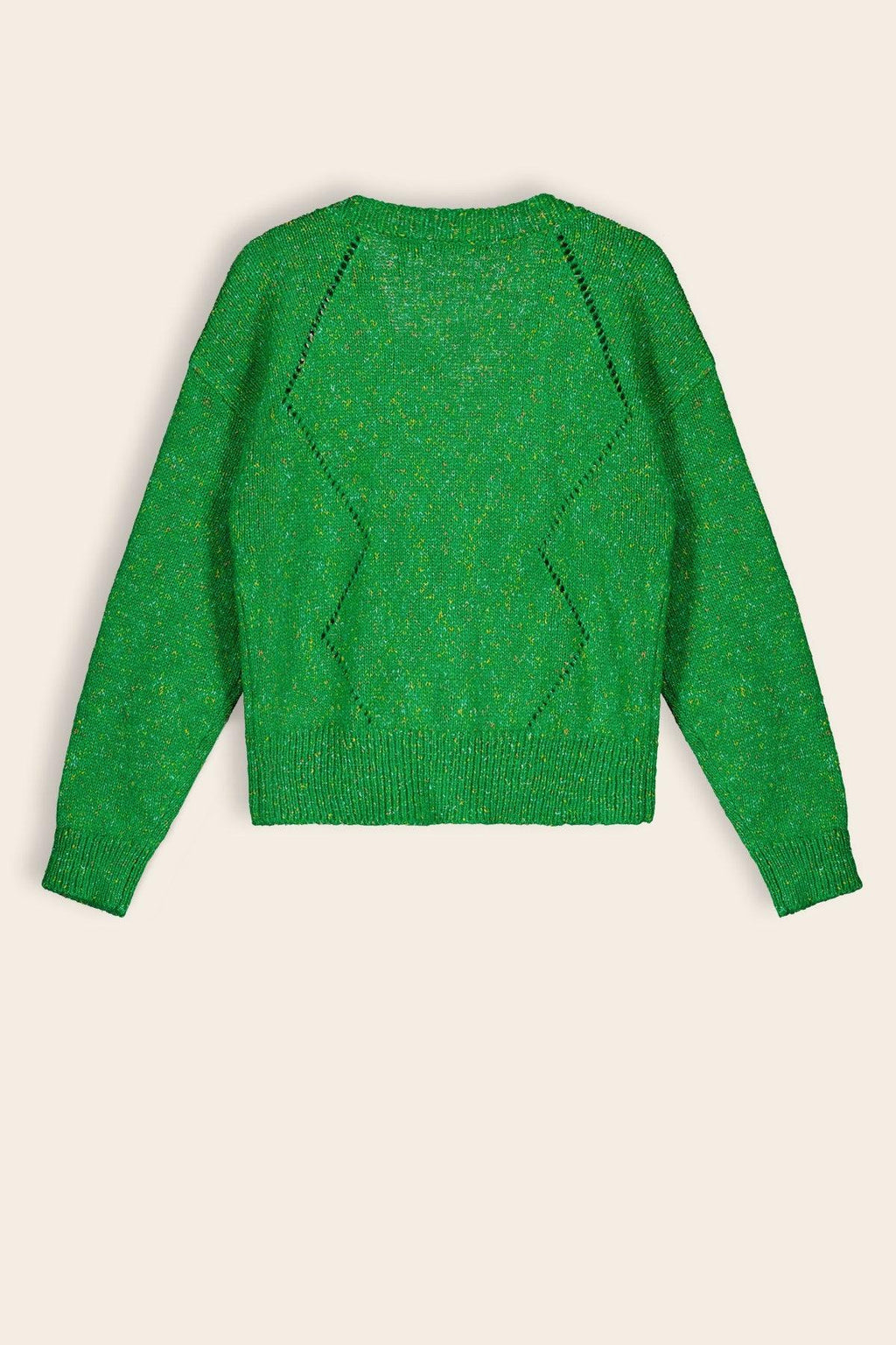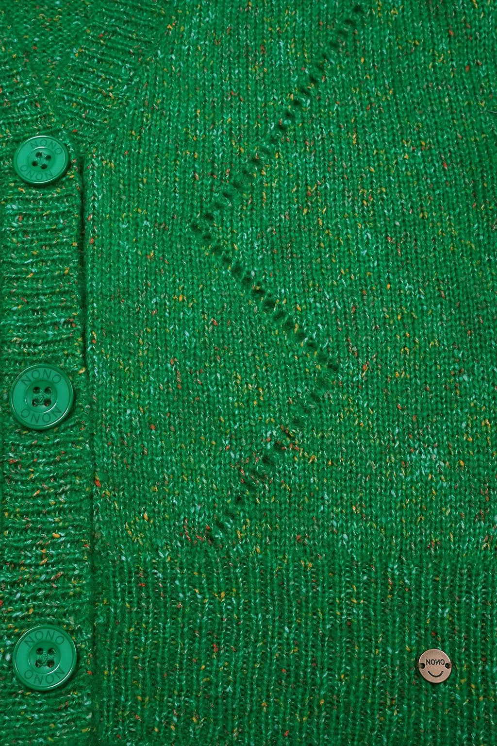 Oversized gebreide V-hals vest met grote knopen. In het garen zie je diverse kleuren blauw, geel, groen en lilac waardoor het vestje niet uni groen is en speels wordt door de subtiele kleurtjes in het vestje.