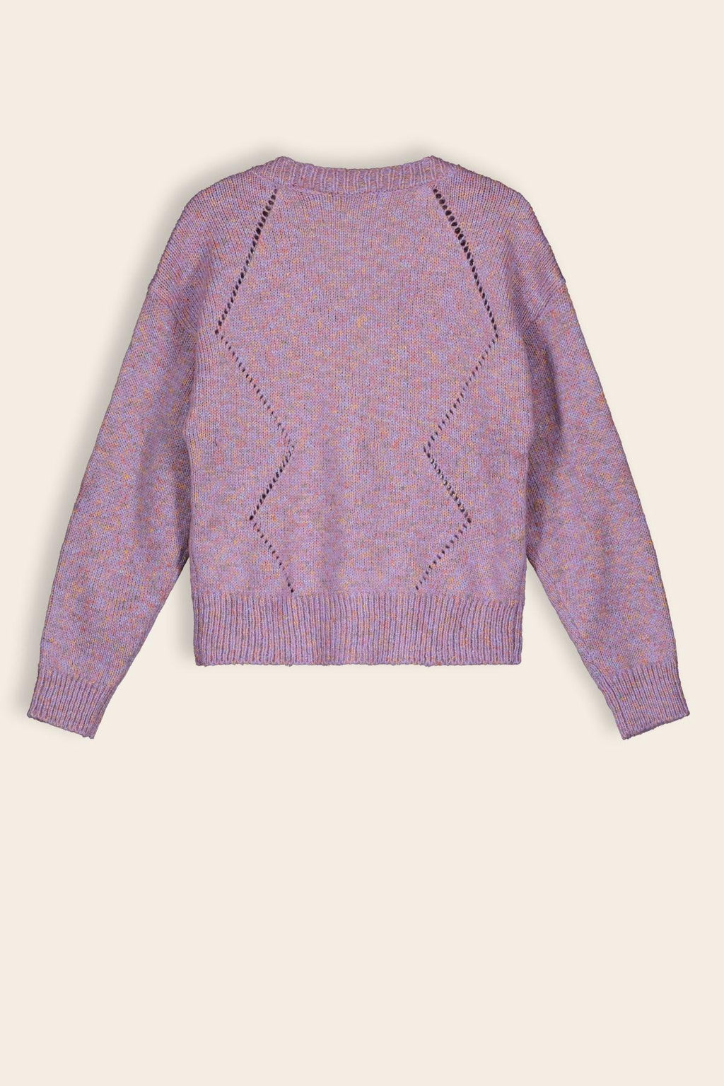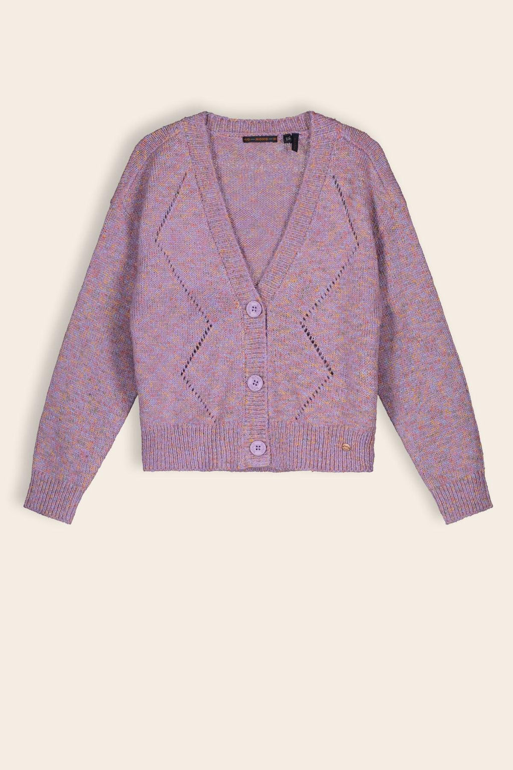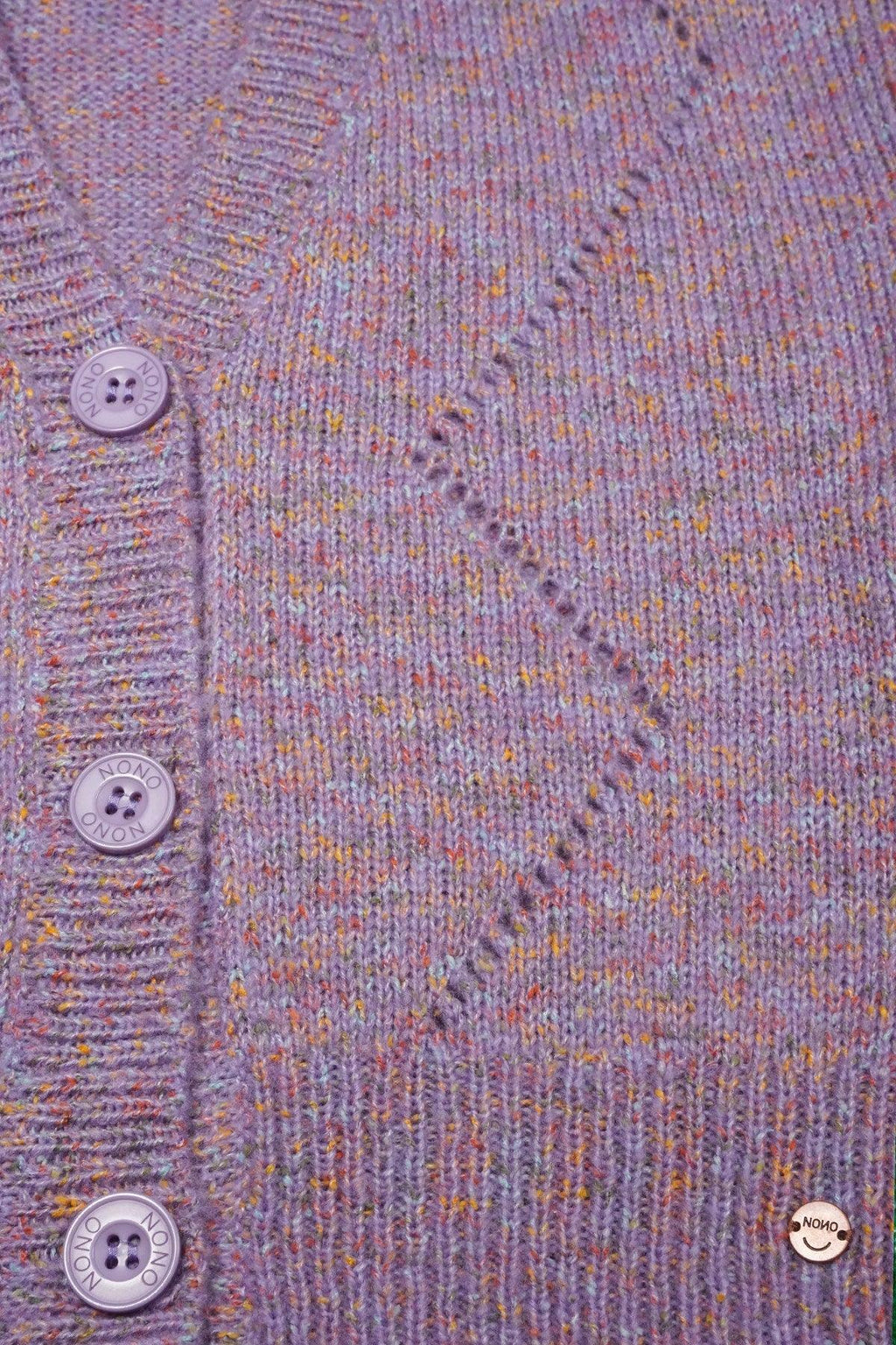 Oversized gebreide V-hals vest met grote knopen. In het garen zie je diverse kleuren blauw, geel, groen en lilac waardoor het vestje niet uni groen is en speels wordt door de subtiele kleurtjes in het vestje.