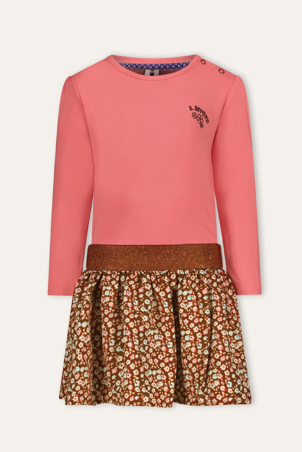 Jurkje Belle is toch te lief voor jouw kleintje! De top van dit jurkje heeft een mooie roze kleur en het rokje heeft een vrolijke bloemenprint. Het jurkje heeft een elastieken band in een mooie bronskleur.