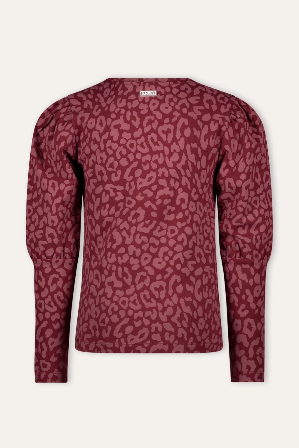B.Nosy top Deni is een echte eyecatcher. De mooie diep rode kleur met daarom een lichtroze fijne panterprint zorgt voor een prachtige kleurencombinatie. Het leuke detail bij de mouwen maakt het shirtje nog leuker! Combineer met onze Doutzen pants voor een super toffe look!