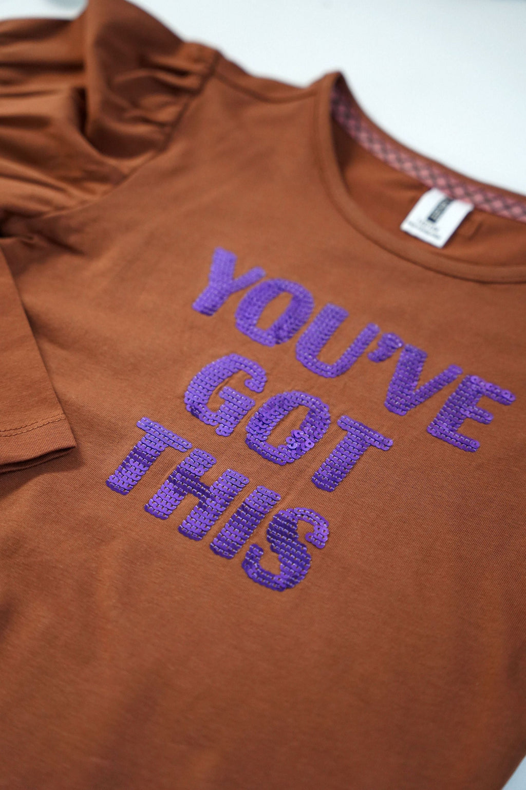 You've got this! Met dit t-shirt ben je zeker helemaal klaar voor de wintermaanden. Het t-shirt heeft een mooie donkerbruine kleur met een toffe paarse tekst op de voorkant. Het t-shirt heeft lange mouwen en een leuk effect bij de mouwen.!