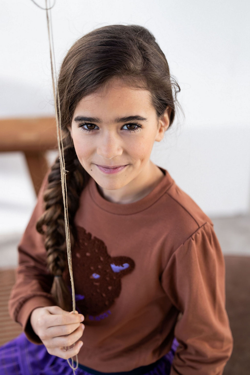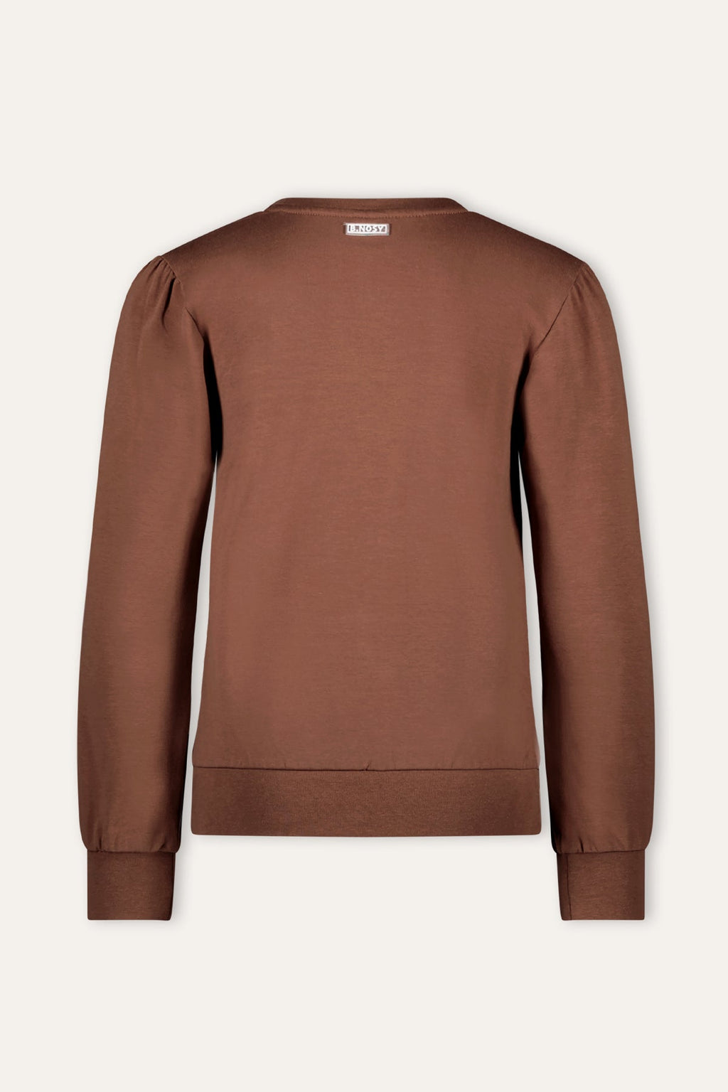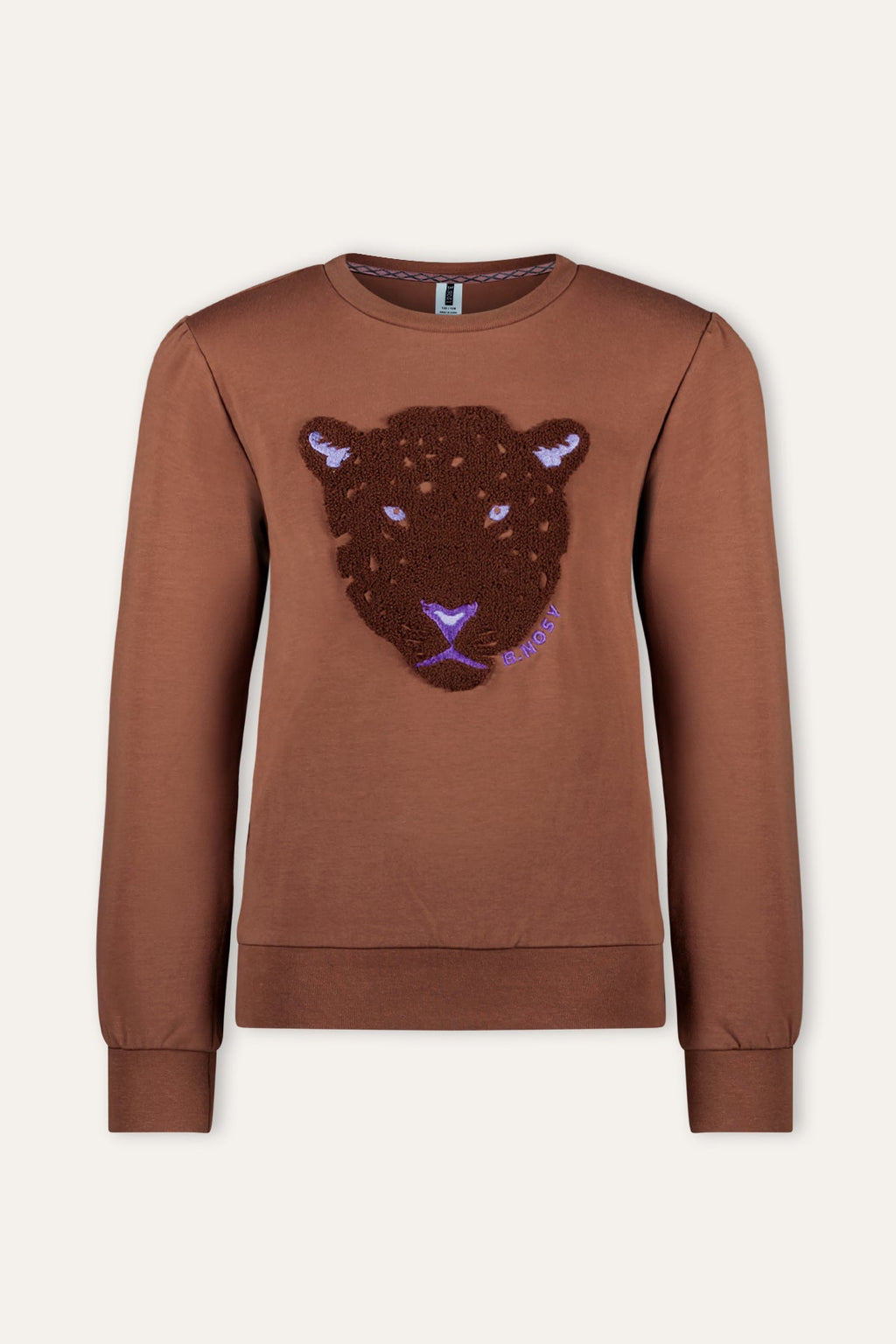 Met sweater Dina zit je er lekker warm bij deze winter! De trui heeft een mooie warme cappuccino kleur en is gemaakt van een zacht CMIA-katoen. De trui heeft een donker bruin met paars artwork op de borst.
