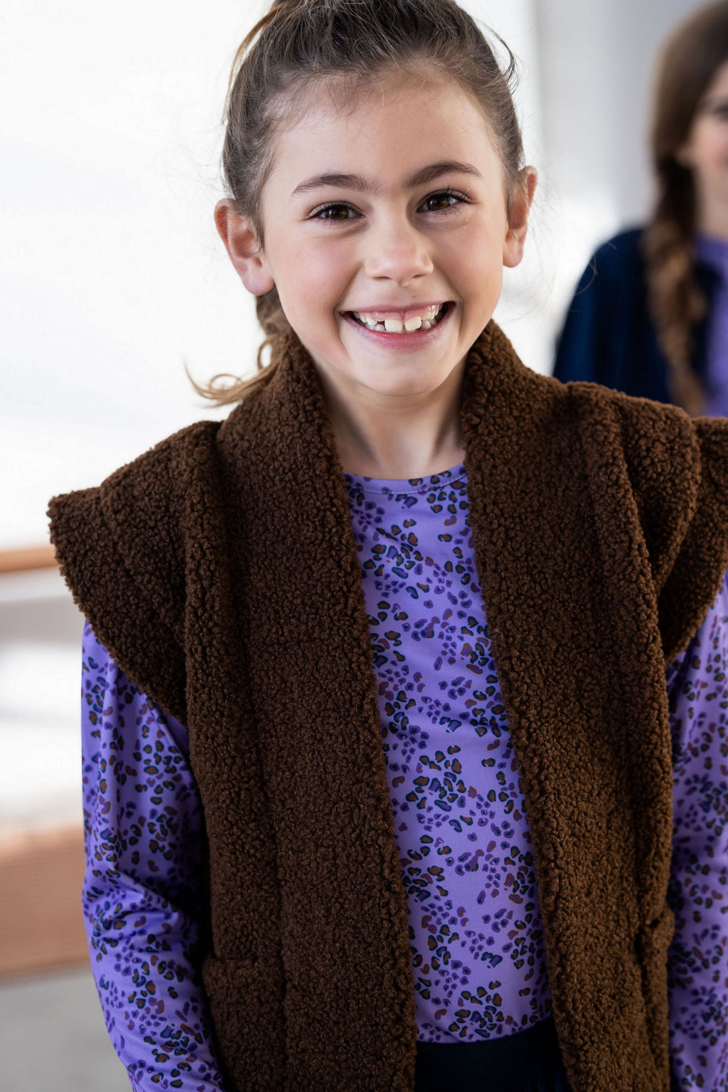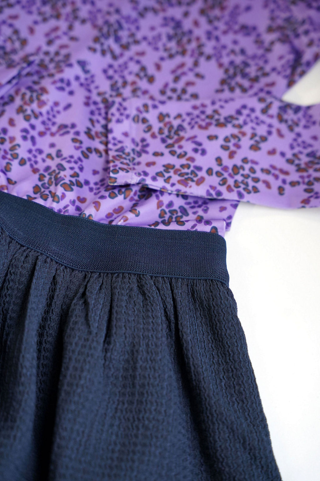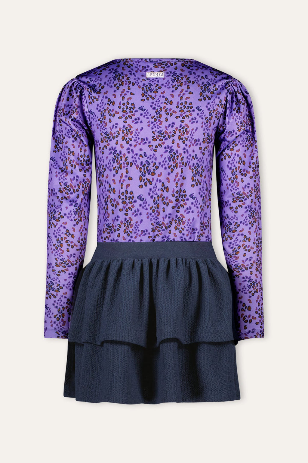 Wow! Hoe tof is dit jurkje! De top van dit jurkje heeft een toffe paarse kleur met een te gekke panter allover print. Het rokje heeft een fijne crincle donkerblauwe stof. Hiermee steel je zeker de show.
