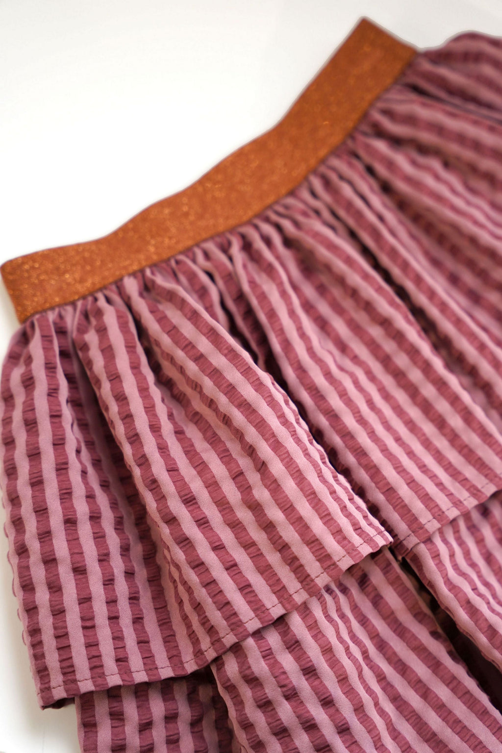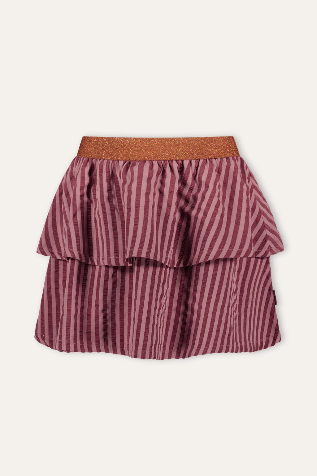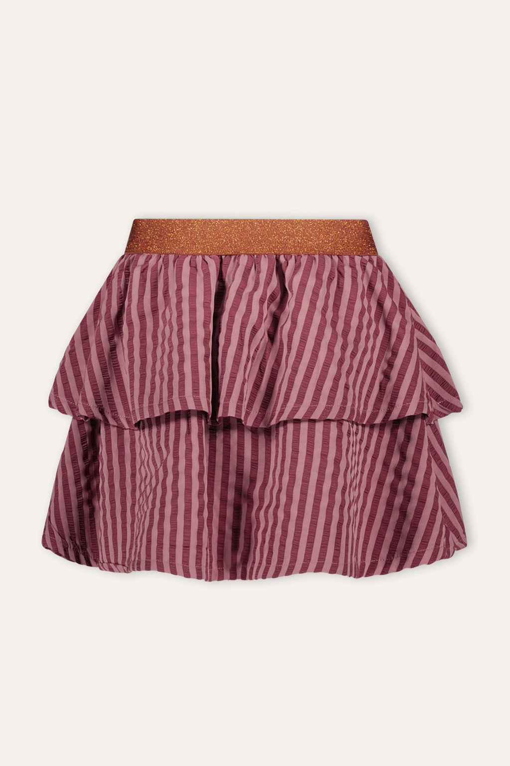 Dit prachtige rokje is gemaakt van een soepel vallende stof die elke beweging elegant laat zwieren. De roze streepjes print voegt een vleugje vrolijkheid toe aan de look. De bronzen glitter elastieken band voegt nog een extra beetje glamour toe en zorgt voor een comfortabele en perfecte pasvorm. Dit rokje is ook heel erg leuk voor een feestje!