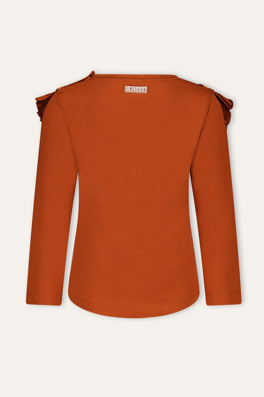 Hoe leuk is de Phie! Dit te gekke t-shirt heeft lange mouwen en is daarom perfect voor de koelere dagen. Met de schattige ruffles aan de schouders en artwork op de linkerborst is dit t-shirt een echte blikvanger. Het t-shirt heeft een mooie gingerbread kleur.