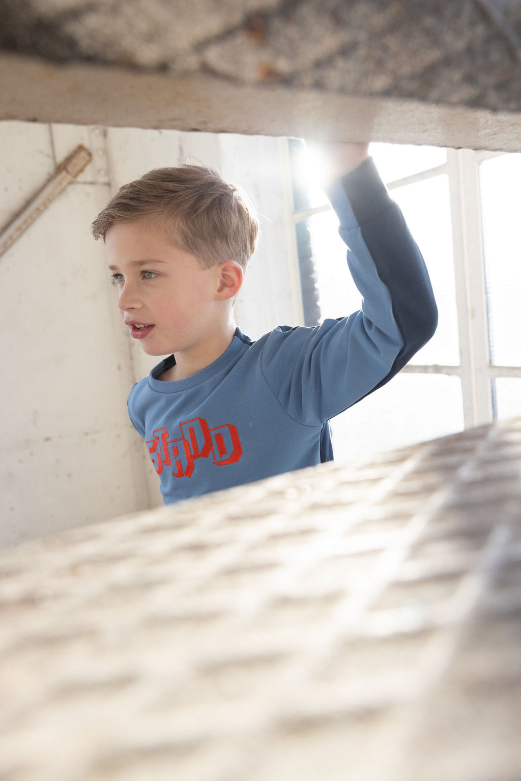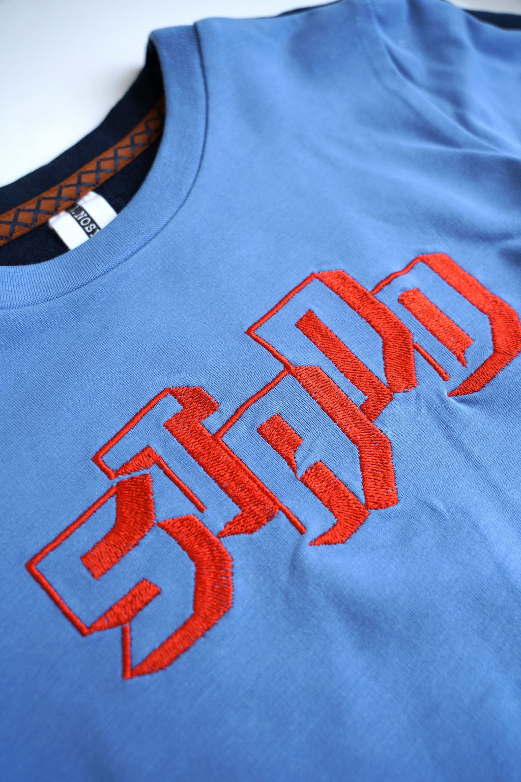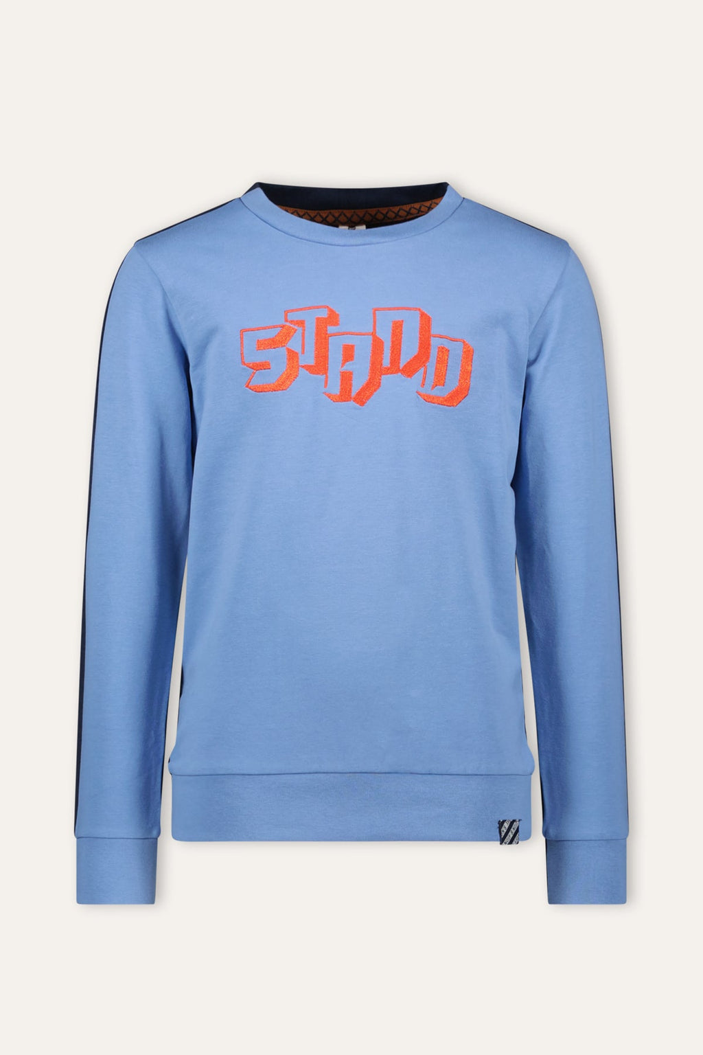 STAND UP! Deze trui is echt uniek! De trui heeft een lichtblauwe kleur aan de voorkant en een donkerblauwe kleur aan de achterkant. Het artwork heeft een toffe rode kleur.