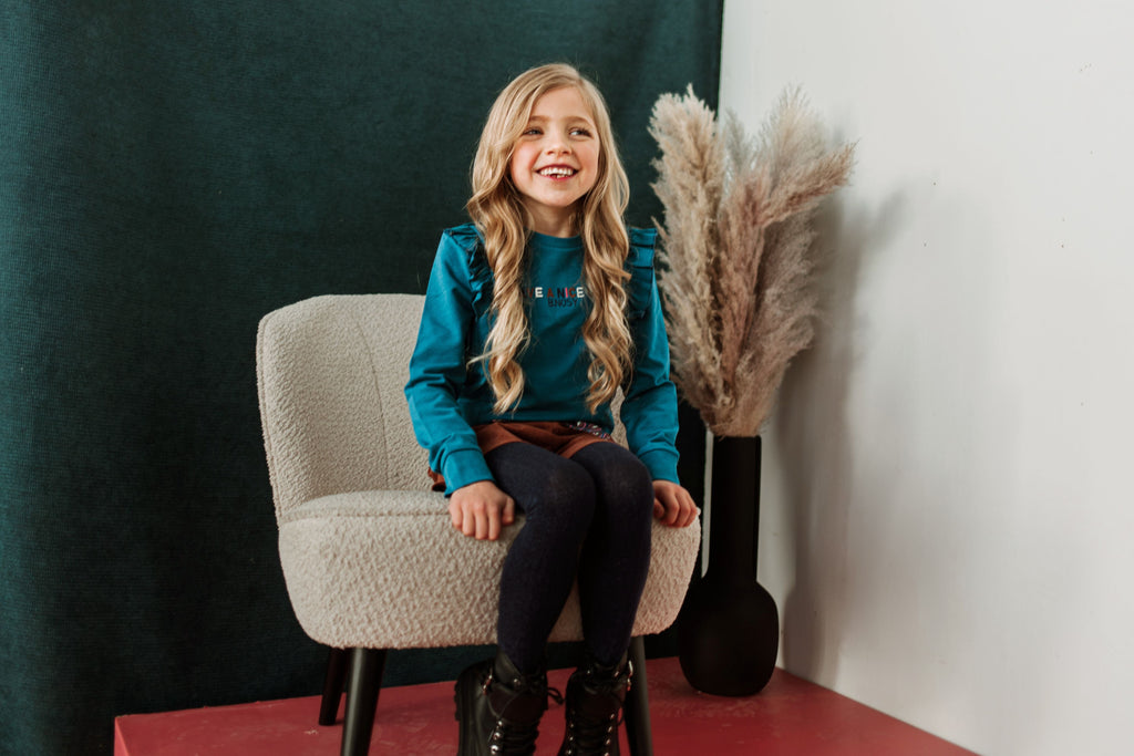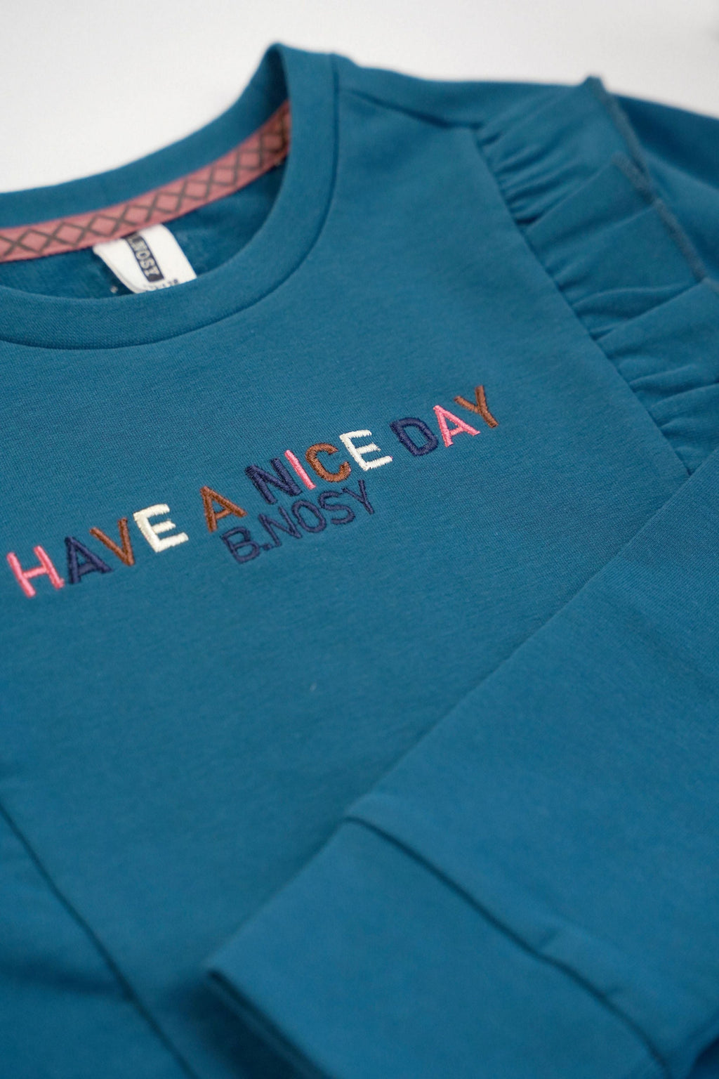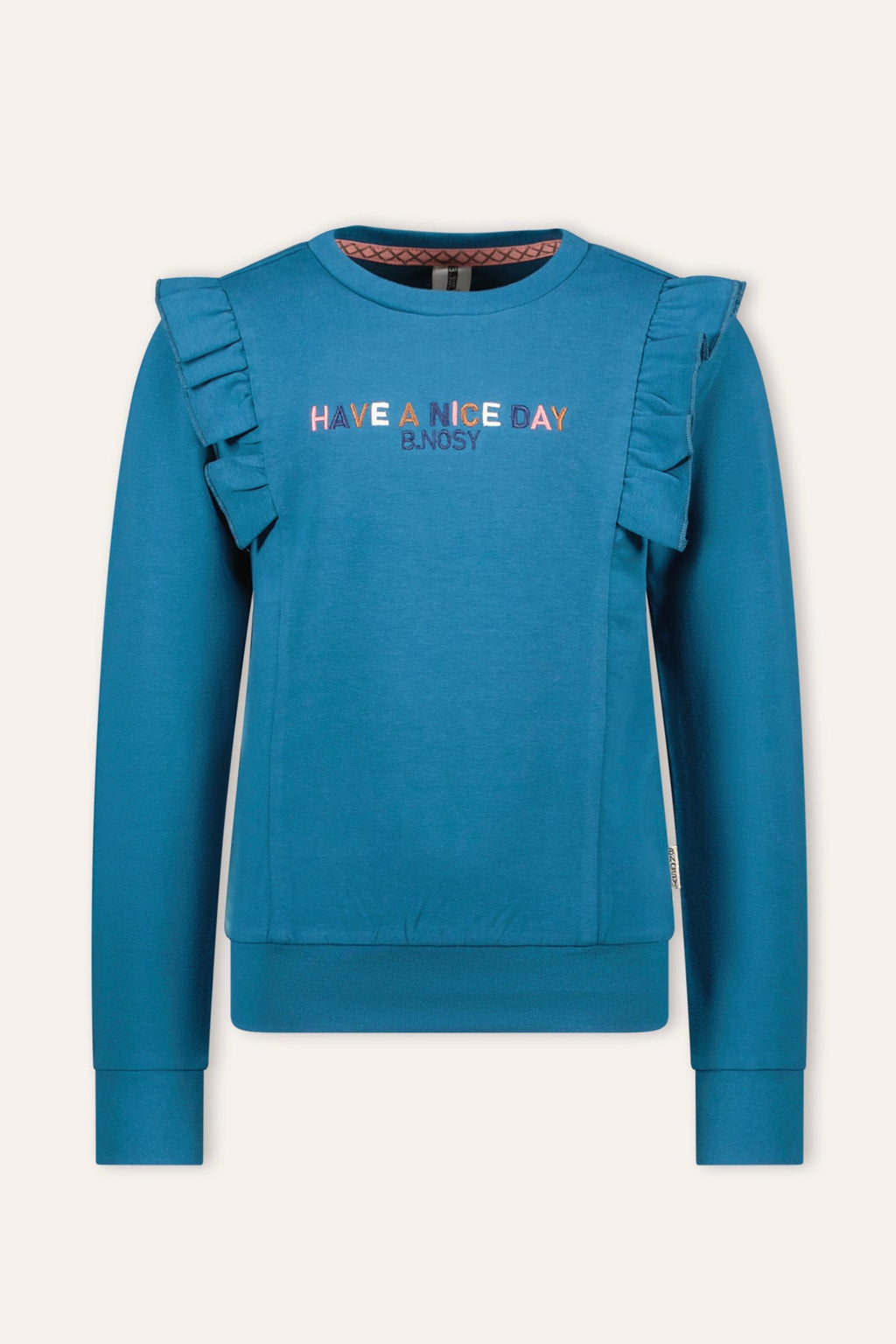 Have a nice day! In trui Vajen zul je zeker een mooie dag beleven! Deze toffe trui heeft een prachtige blauwe kleur en een kleurrijke en geborduurde tekst op de voorkant. De ruffles op de trui zorgen voor een girly-effect, terwijl de trui een stoere pasvorm heeft!