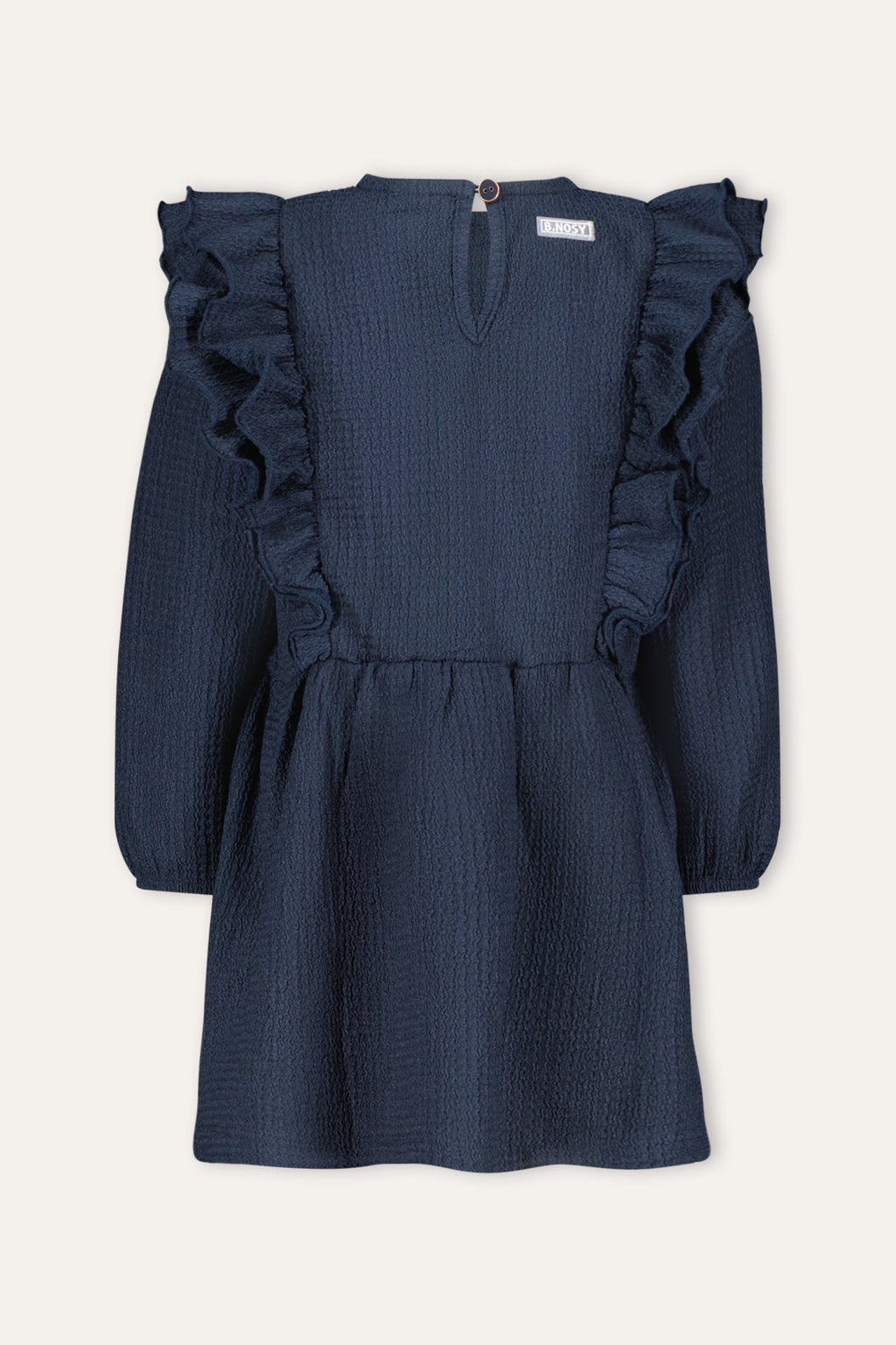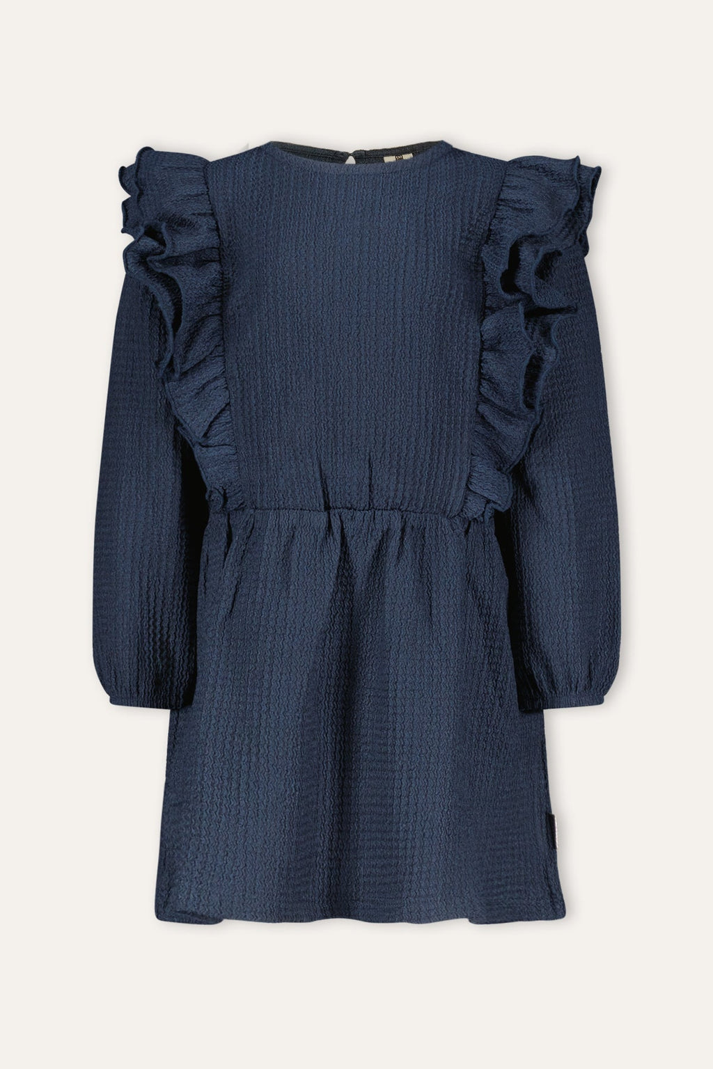 Jurkje Vesta heeft een mooie donkerblauwe kleur en is gemaakt van een leuk structuur materiaal, wat zorgt voor een unieke en modieuze uitstraling. De ruffles aan de voorkant geven een speels en trendy accent, terwijl de lange mouwen het jurkje perfect maken voor koudere dagen.