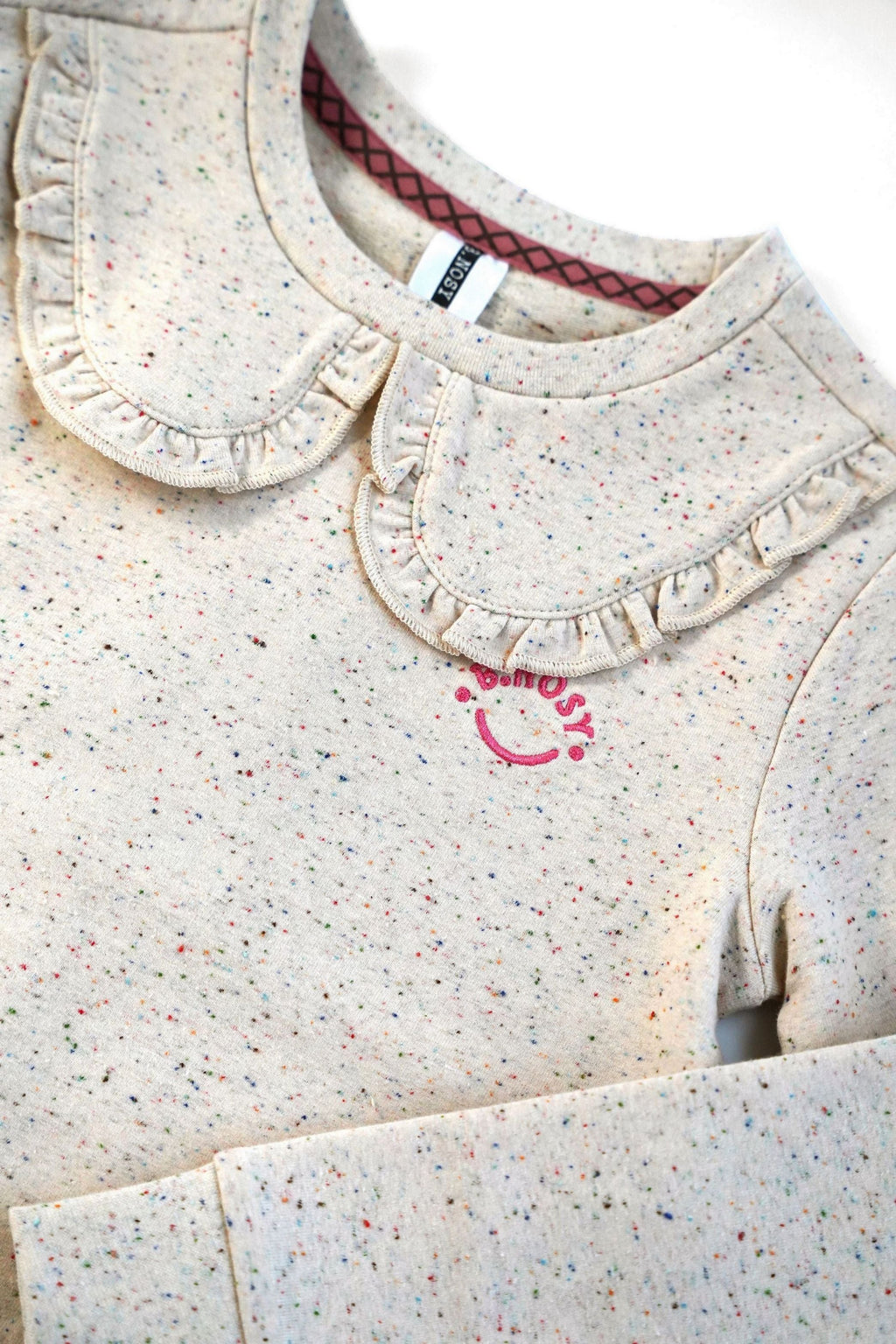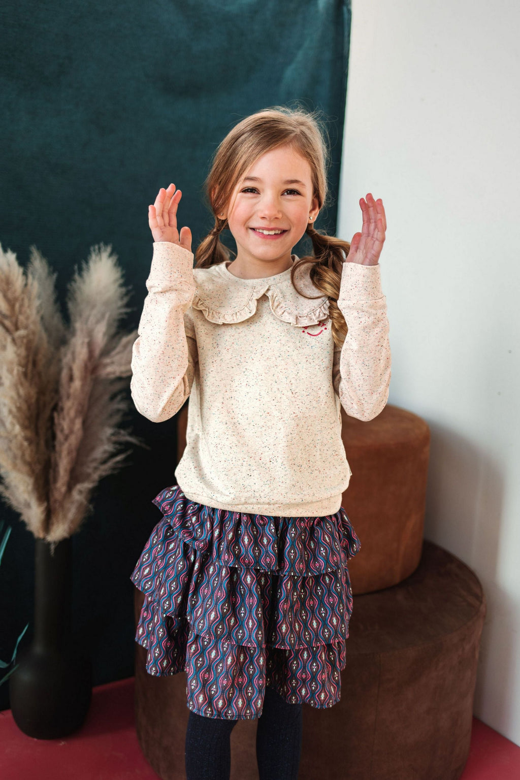 Geef je garderobe een vleugje schattigheid met onze ecru-kleurige trui Vienna. De trui is gemaakt van zacht en comfortabel materiaal. De trui heeft een super schattige en girly kraag. De confetti print maakt deze trui echt uniek.