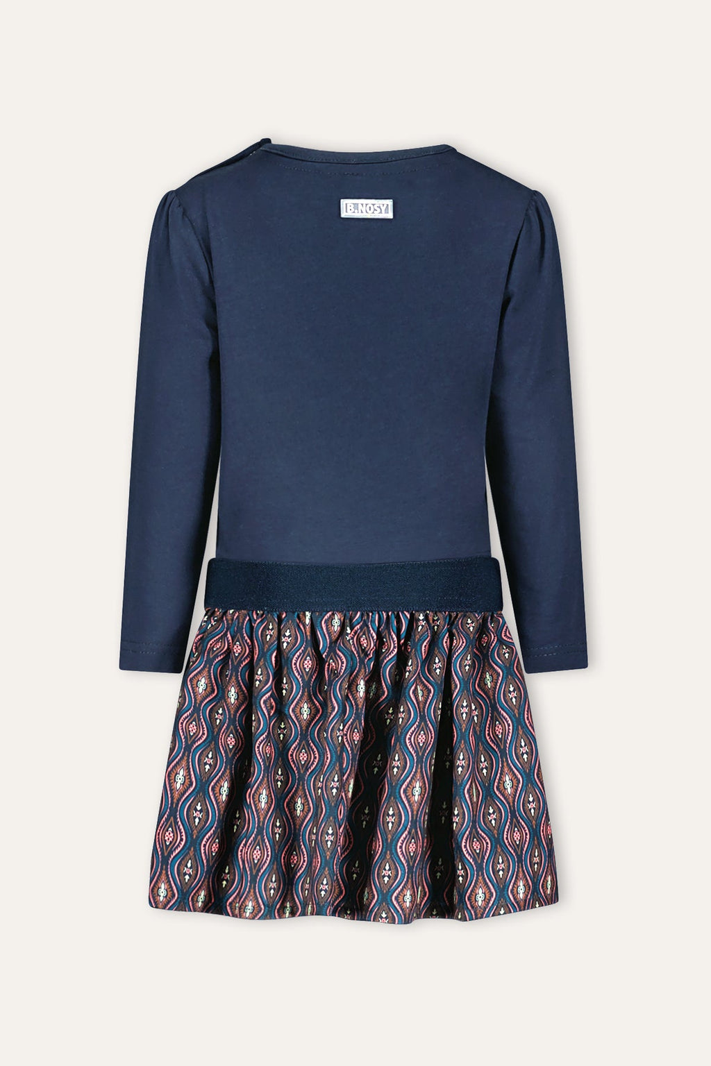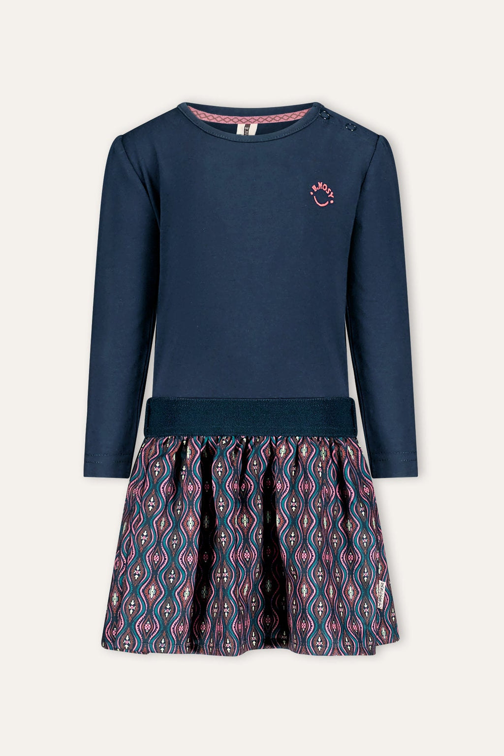 Jurkje Viki is toch te leuk?! Het jurkje heeft een mooie navy top met lange mouwen en een leuk geborduurd artwork op de borst. Het rokje is gemaakt van een fijne stof in een toffe allover print. De elastieken band maakt het jurkje fijn te dragen.