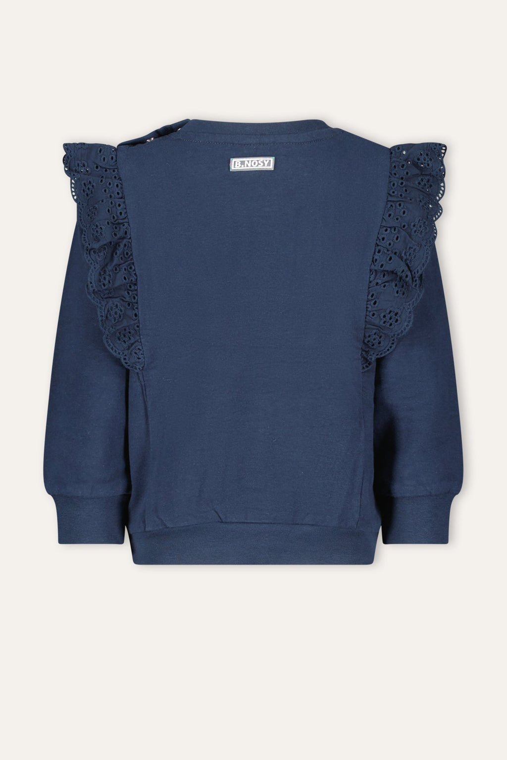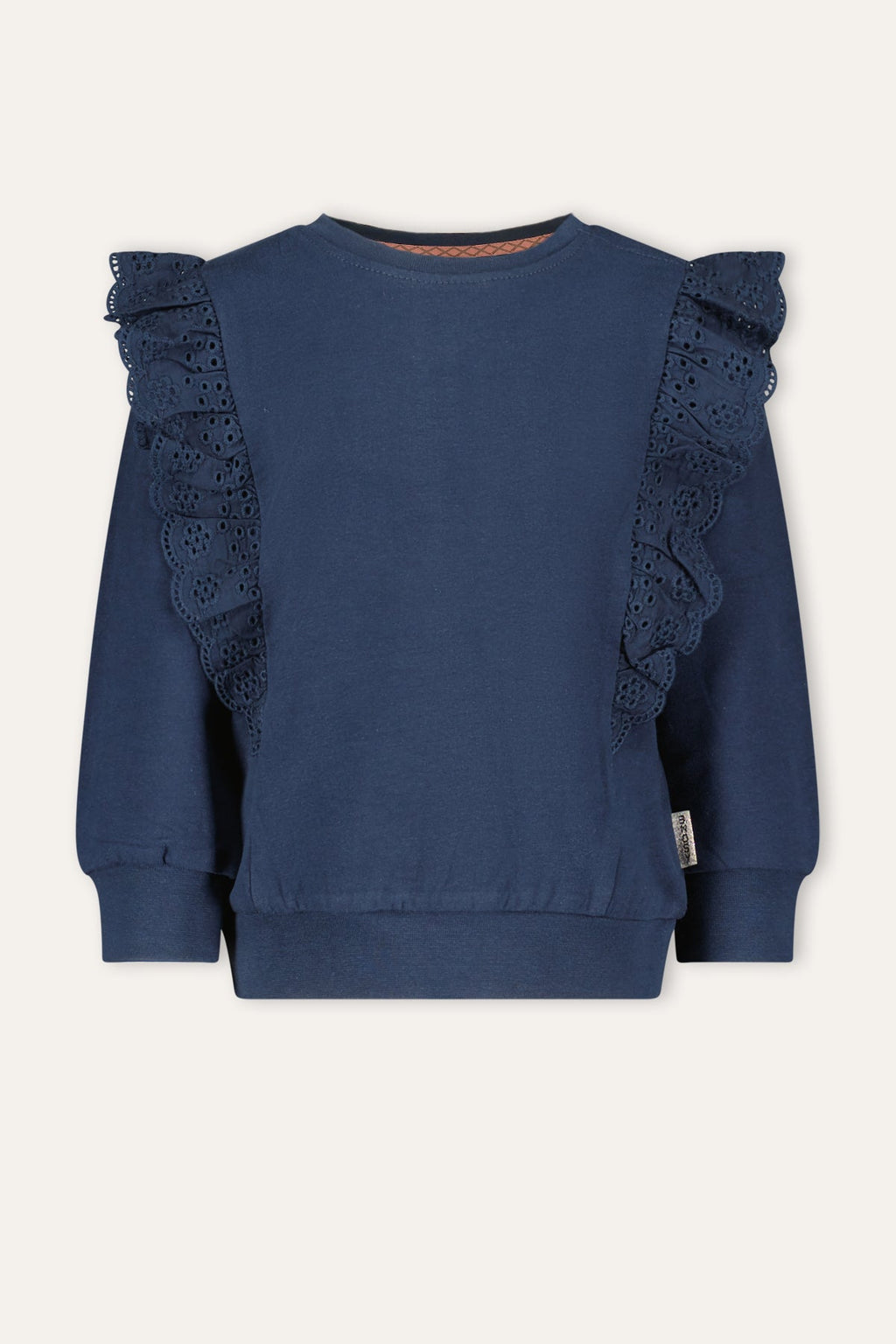 De Vyenna trui is een echte topper! De trui is gemaakt van een zachte stof en draagt super comfortabel. De mooie navy kleur zorgt ervoor dat je de trui eindeloos kunt te combineren. De leuke ruffles maken hem extra schattig voor jou mini!