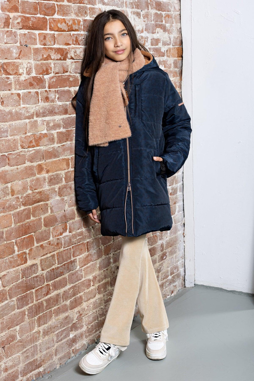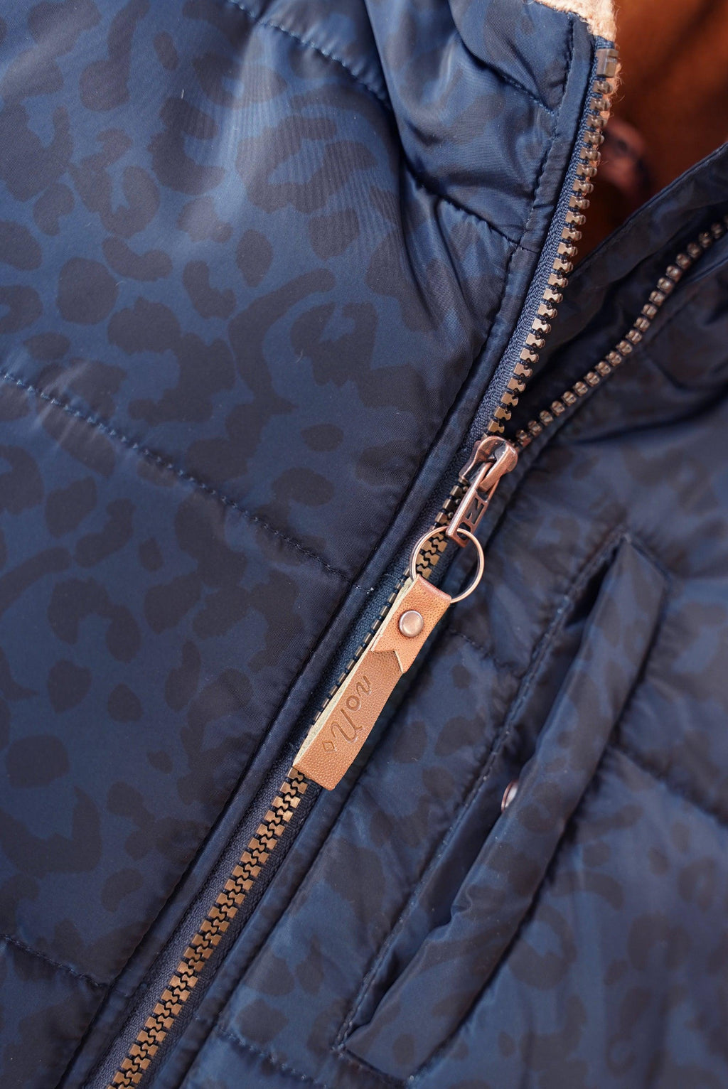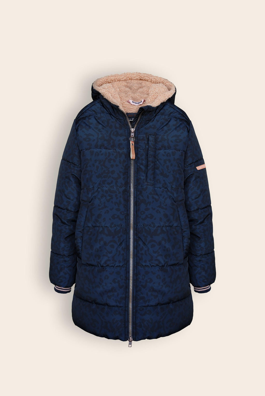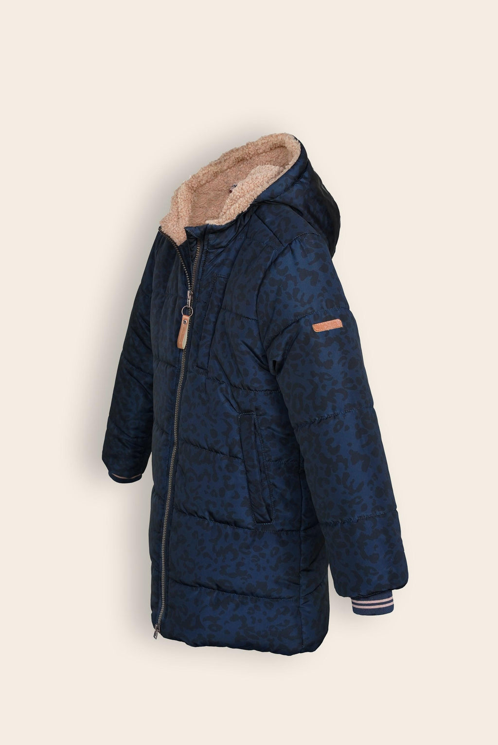 Lange jas Baggy met een tonale subtiele animal print gemaakt van gerecyclede polyester en gerecyclede padding. De jas is voor de helft gevoerd met een zachte licht bruine teddy en de capuchon is niet afneembaar. Insteekzakken zijn gevoerd met fleece voor de warme handen. Handige extra borstzak met drukknoop om wat in te bewaren.