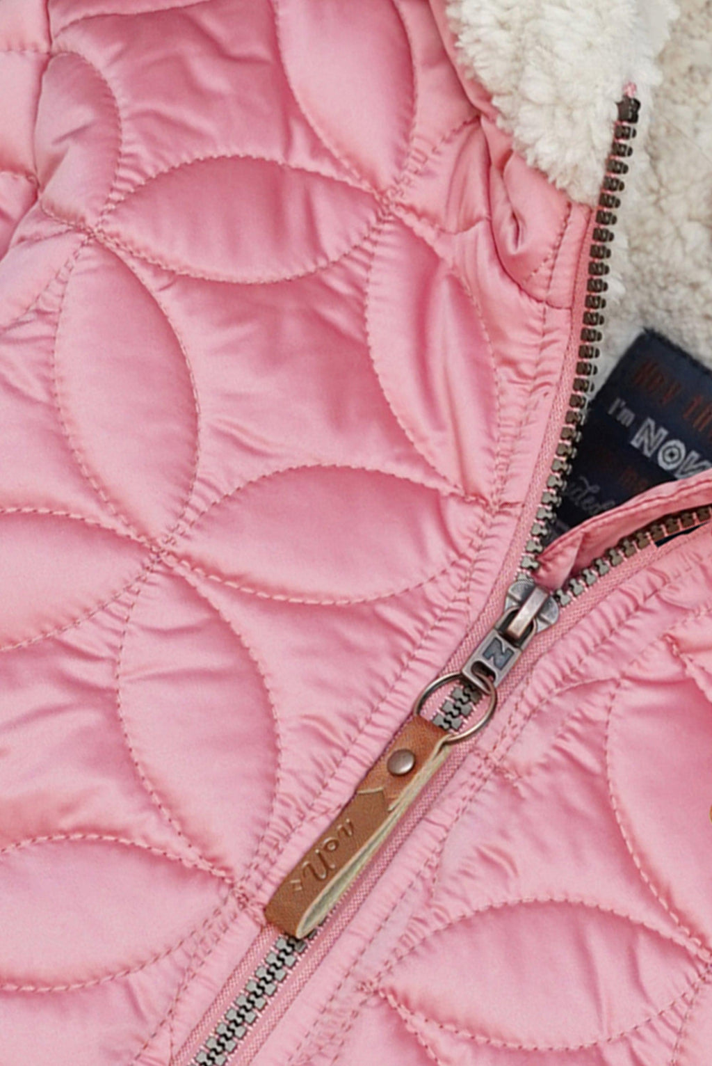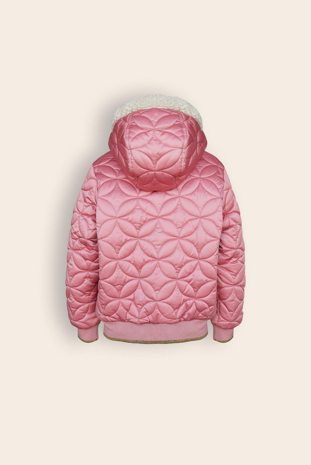 Korte satijnen bomberjas Bestie met een speels circel/blad gestept patroon gemaakt van 100% gerecycled polyester+ gerecyclede padding. Van binnen en in de capuchon is de jas gevoerd met een korharige zachte teddy en de steekzakken zijn gevoerd met een zachte fleece voor de warme handen. De capuchon is niet afneembaar. De jas wordt gesloten met een ritssluiting en heeft ribmanchetten bij de mouw en zoom.
