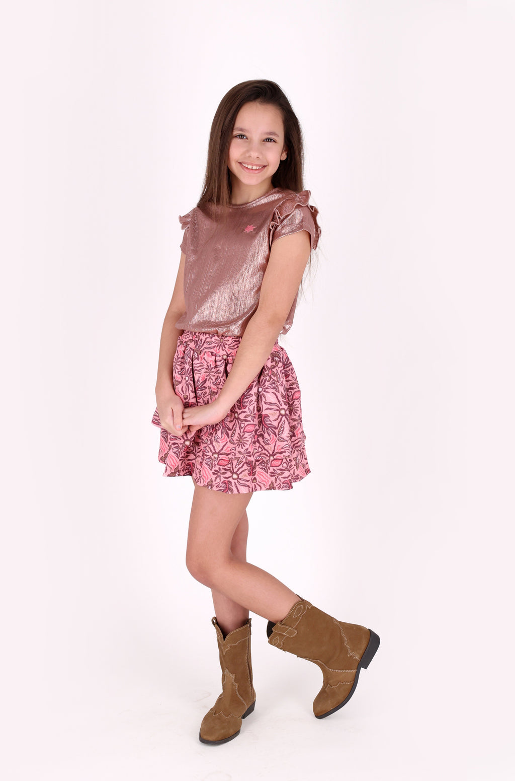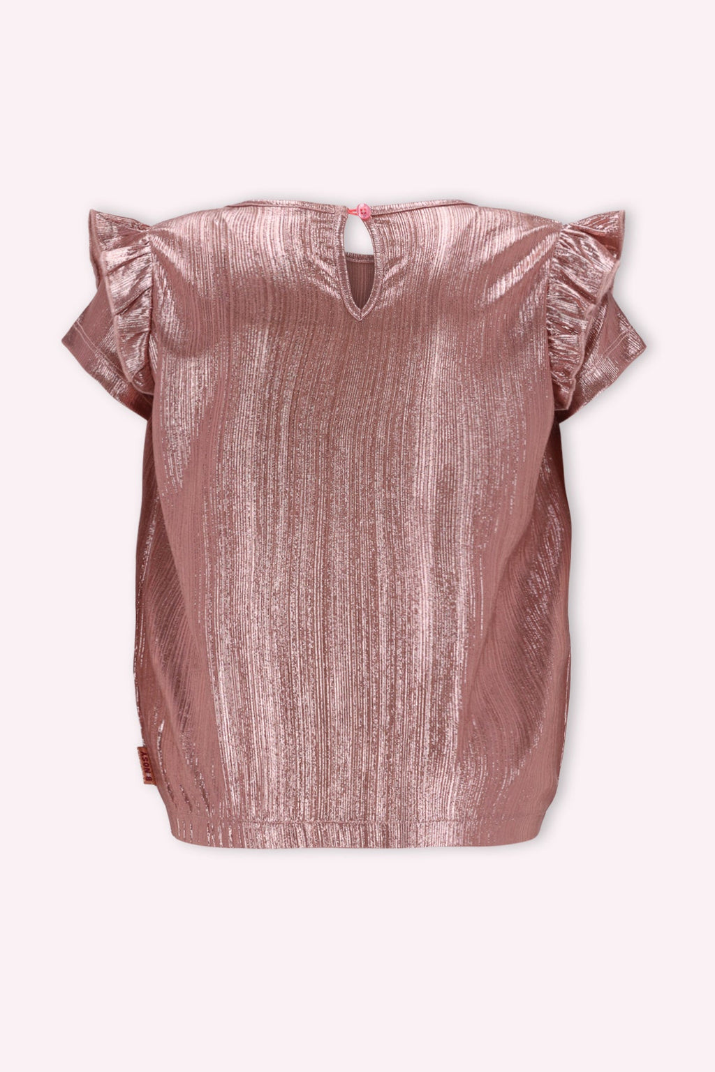 Deze toffe top van B.Nosy is een echte must-have voor meiden! De metallic plissé stof in goud en roze zorgt voor een fashionable uitstraling. Met een subtiel borduurtje op de borst en een speelse ruche langs de mouw is dit een trendy item. Perfect om te mixen en matchen met de broeken Penny en Priya voor een complete outfit!