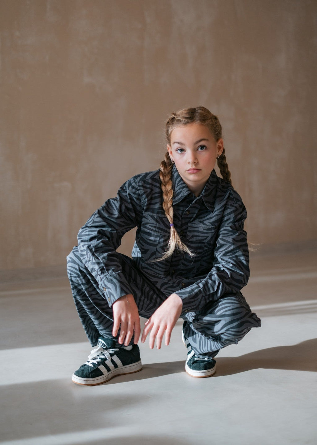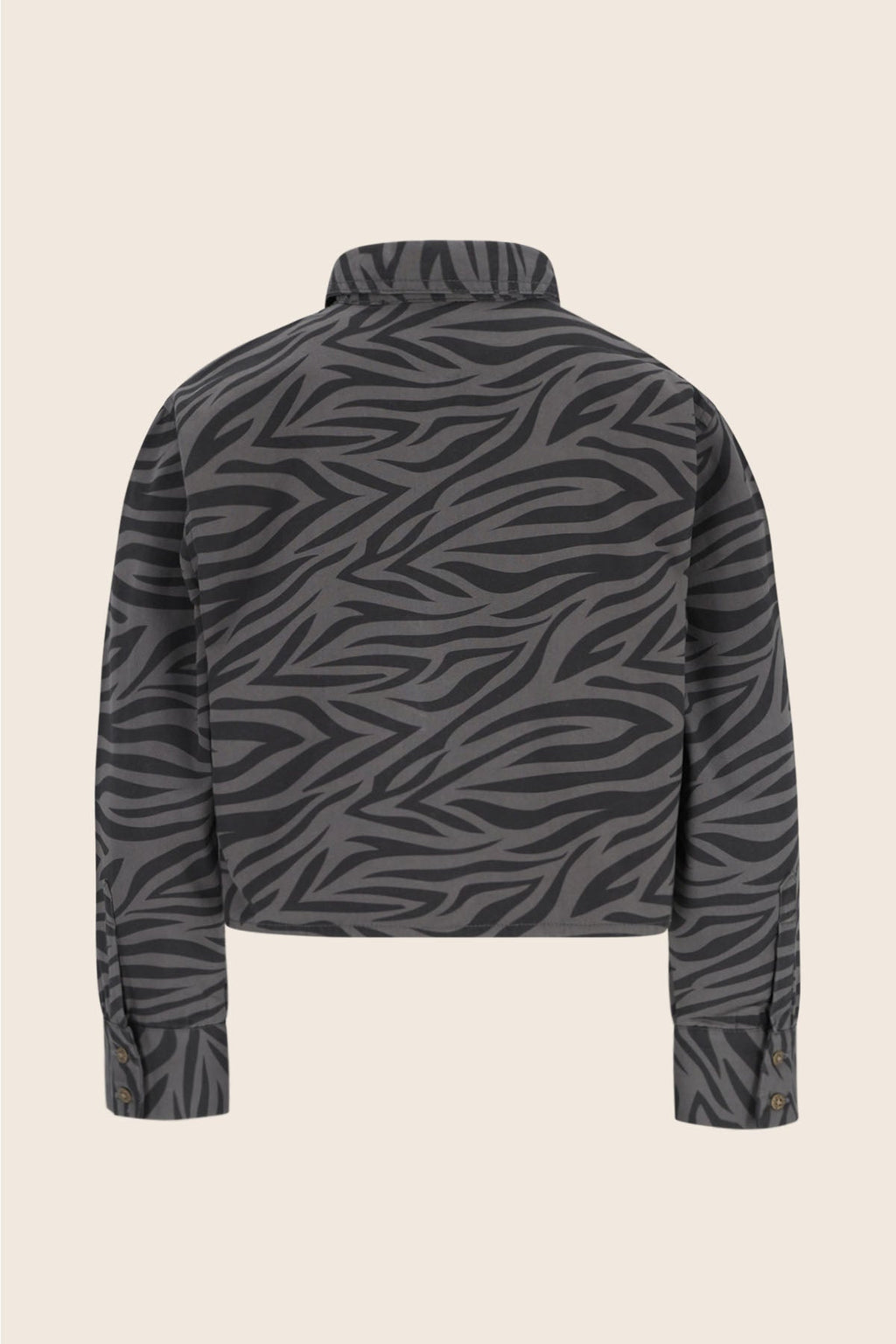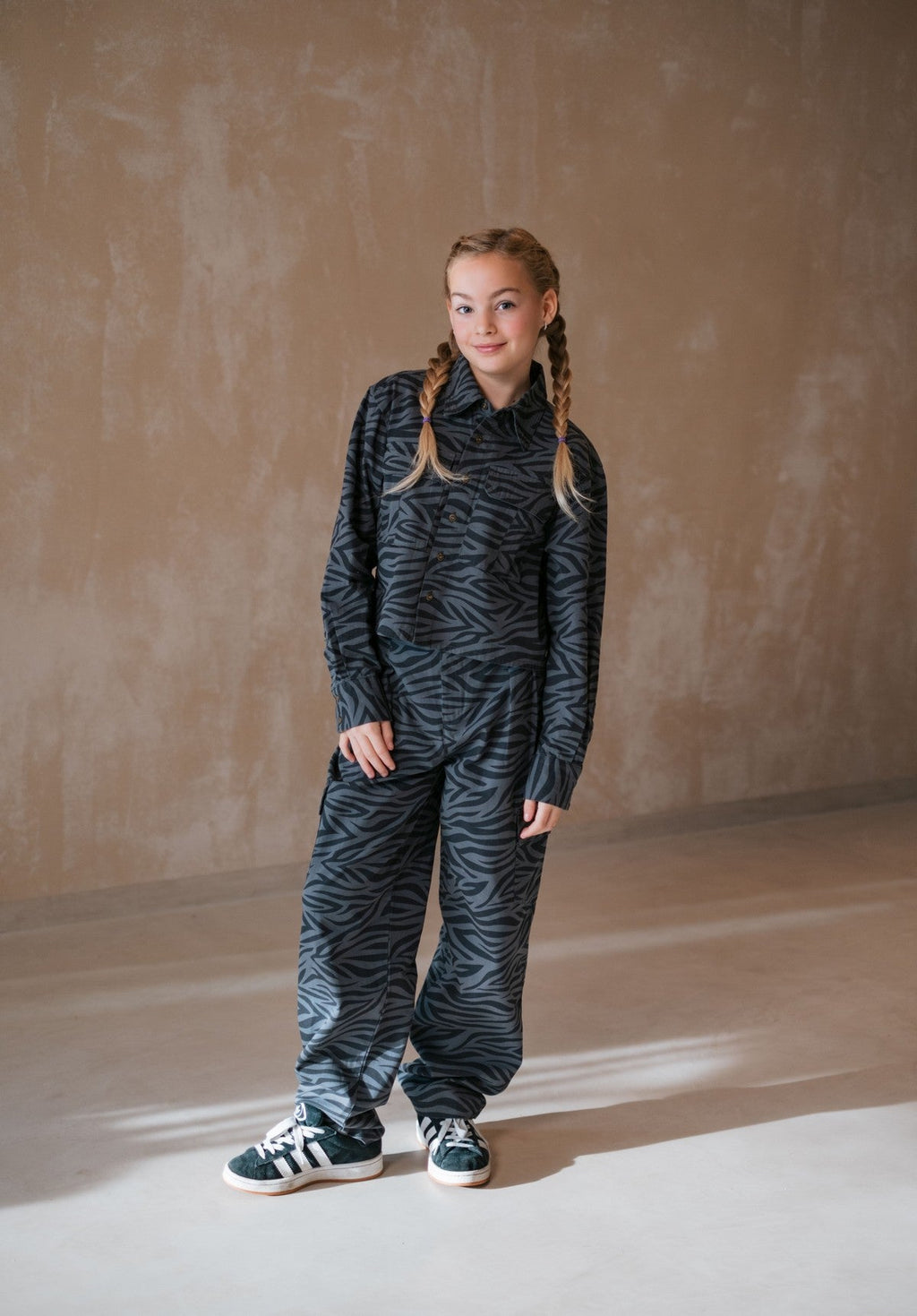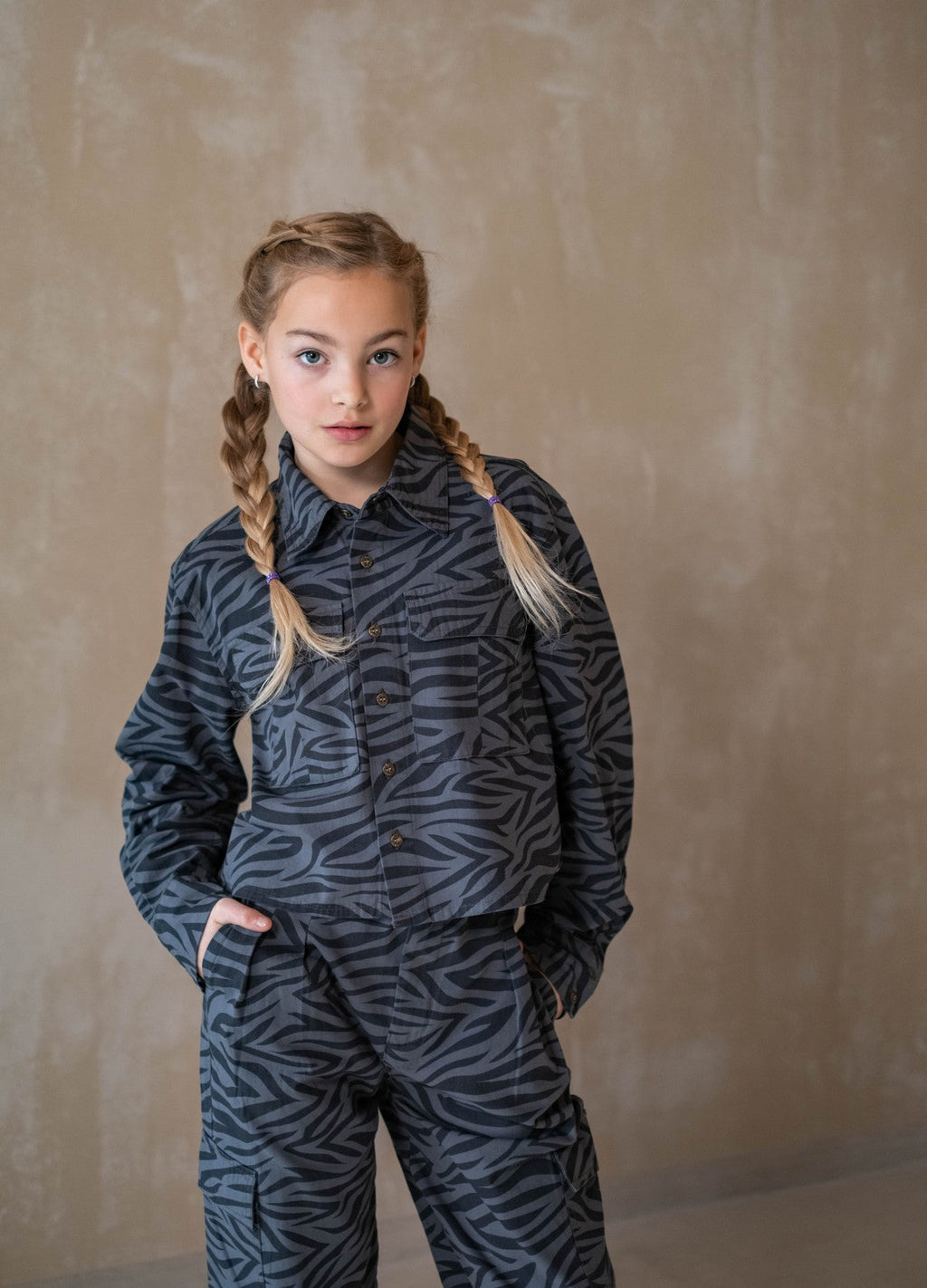 De Like Flo Cassy blouse in grijs is een eigentijds item dat perfect past bij de garderobe van jonge fashionista’s. Dankzij de mix van katoen en elastaan voelt de blouse comfortabel aan en beweegt hij soepel mee. De stevige twill stof met subtiele zebra print in ton sur ton geeft een stoere, maar stijlvolle uitstraling. Combineer hem met de Filly broek en het Emille topje voor een complete set. Scan de QR-code en ontdek het verhaal achter dit kledingstuk!