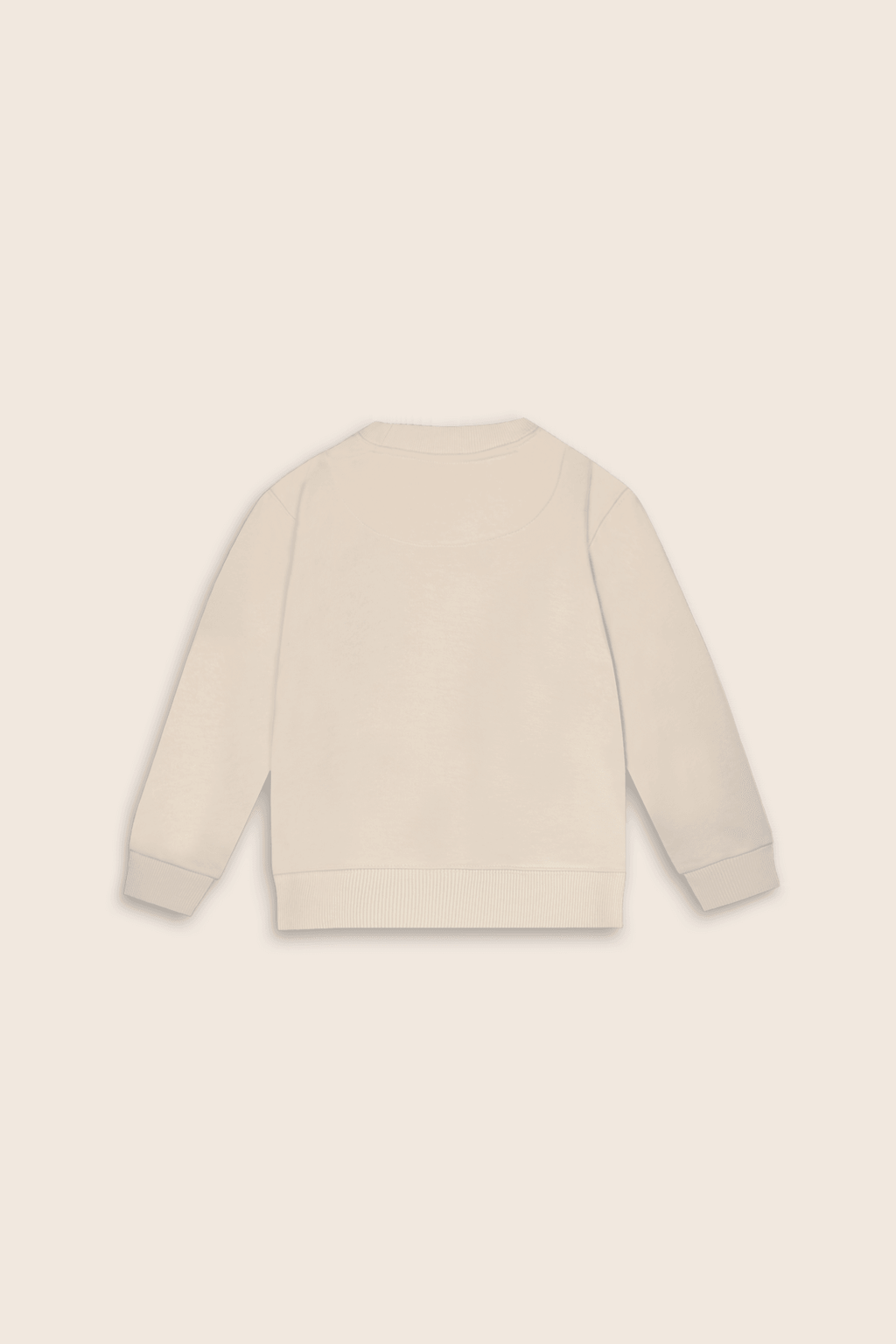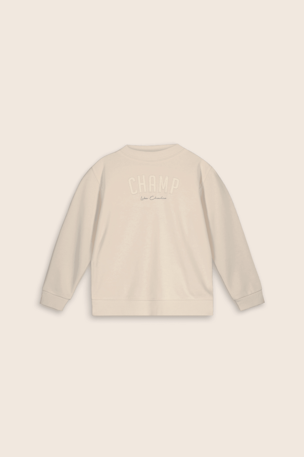 Charlie Ray roundneck sweater CHARLIE off white. Heerlijke zachte comfy sweater met CHAMP applicatie in blue denim twill.
