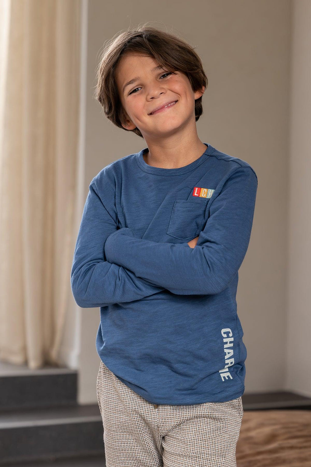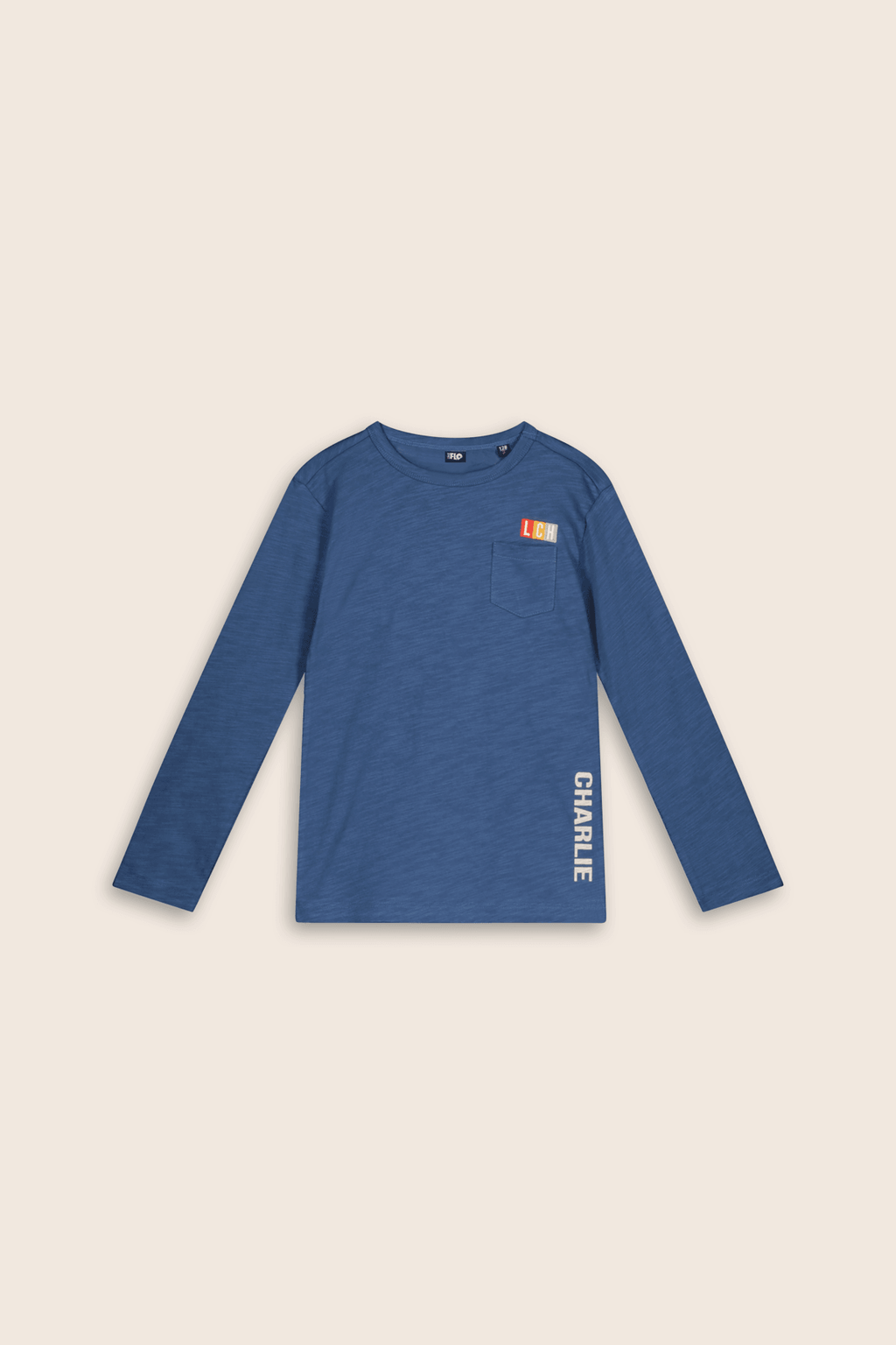 Charlie Ray long sleeve tee SIR CHARLIE. Blue denim tee van slub jersey met chest pocket en luxe borduur. Het is een wat losser vallend model, geen slimfit.