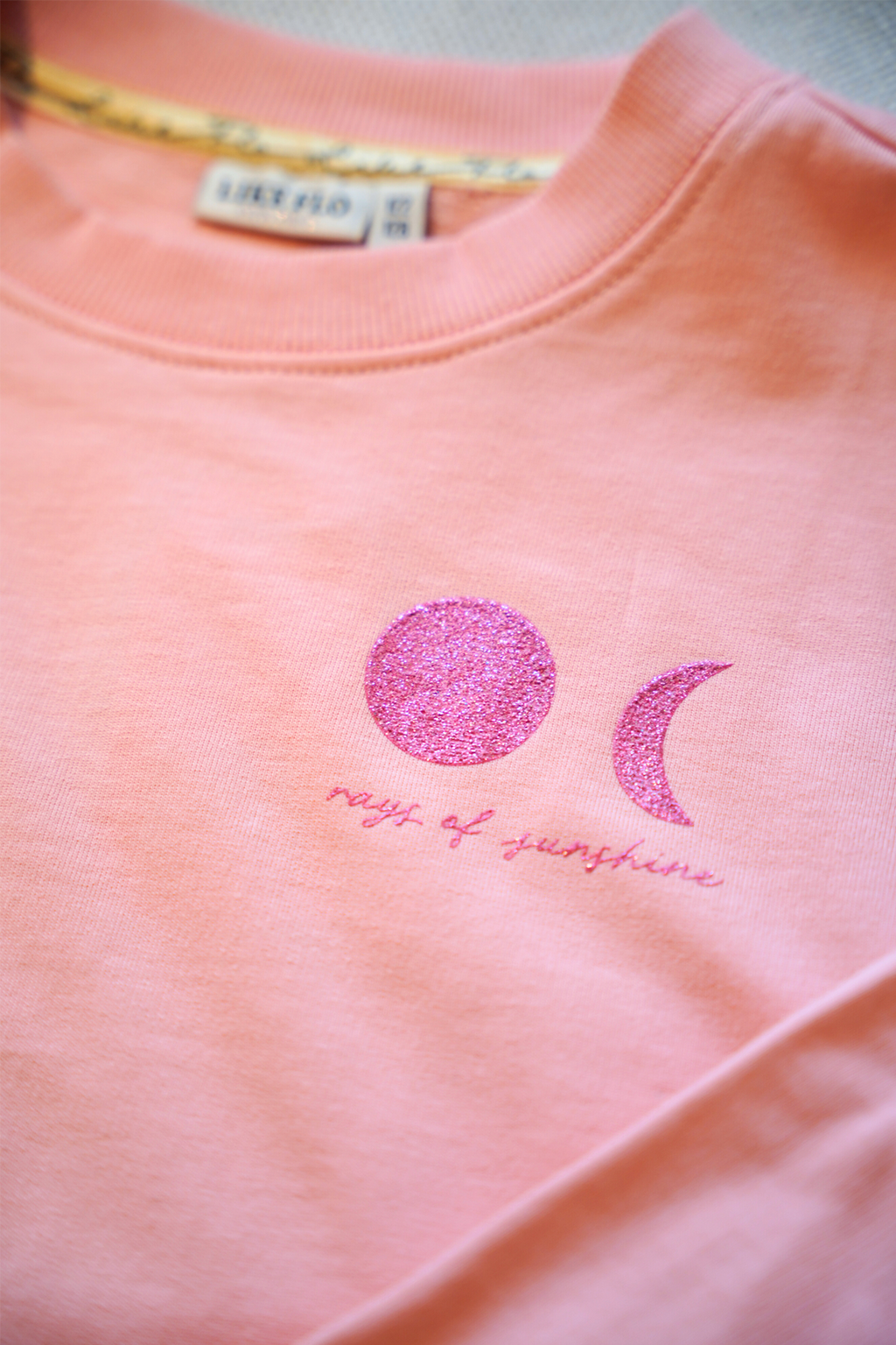 Zacht katoen, mooie roze glitterprint van zon/maan op borst en als backprint. Makkelijk te combineren.