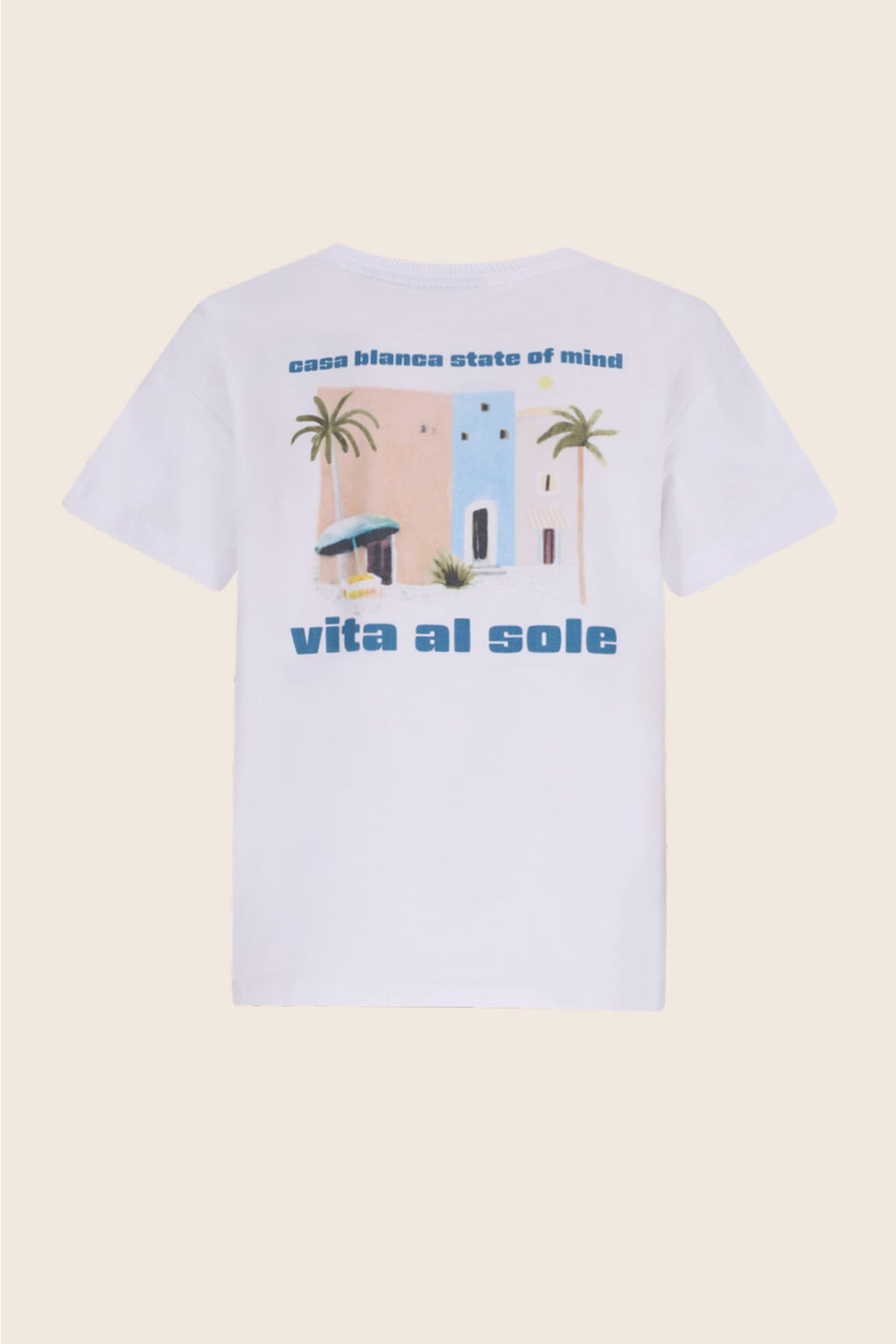 Oversized t-shirt in kleur off white. Met backprint van tropische huisjes, en op voorkant print op de borst van zonnetje.