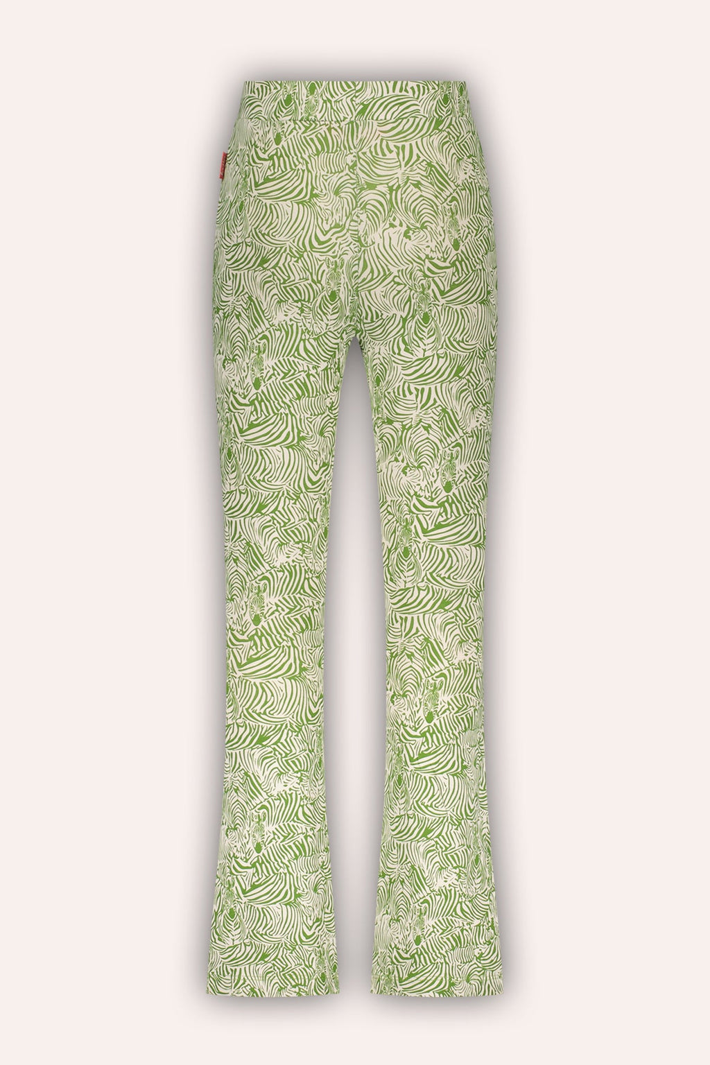 De flared broek 'Poppy' met zebraprint in fris groen-wit, gemaakt van zacht biologisch katoen, biedt niet alleen dagelijks comfort maar ook een eigentijdse en bewuste stijl. Draag het moeiteloos met een eenvoudig T-shirt voor een chique uitstraling. Een modieuze expressie met een positieve impact op de wereld om ons heen, FOR A BETTER NEXTERDAY. Wist je trouwens dat je door het scannen van de QR code de reis kunt zien die dit kledingstuk al heeft afgelegd? Verkrijgbaar in de maten 92-152.