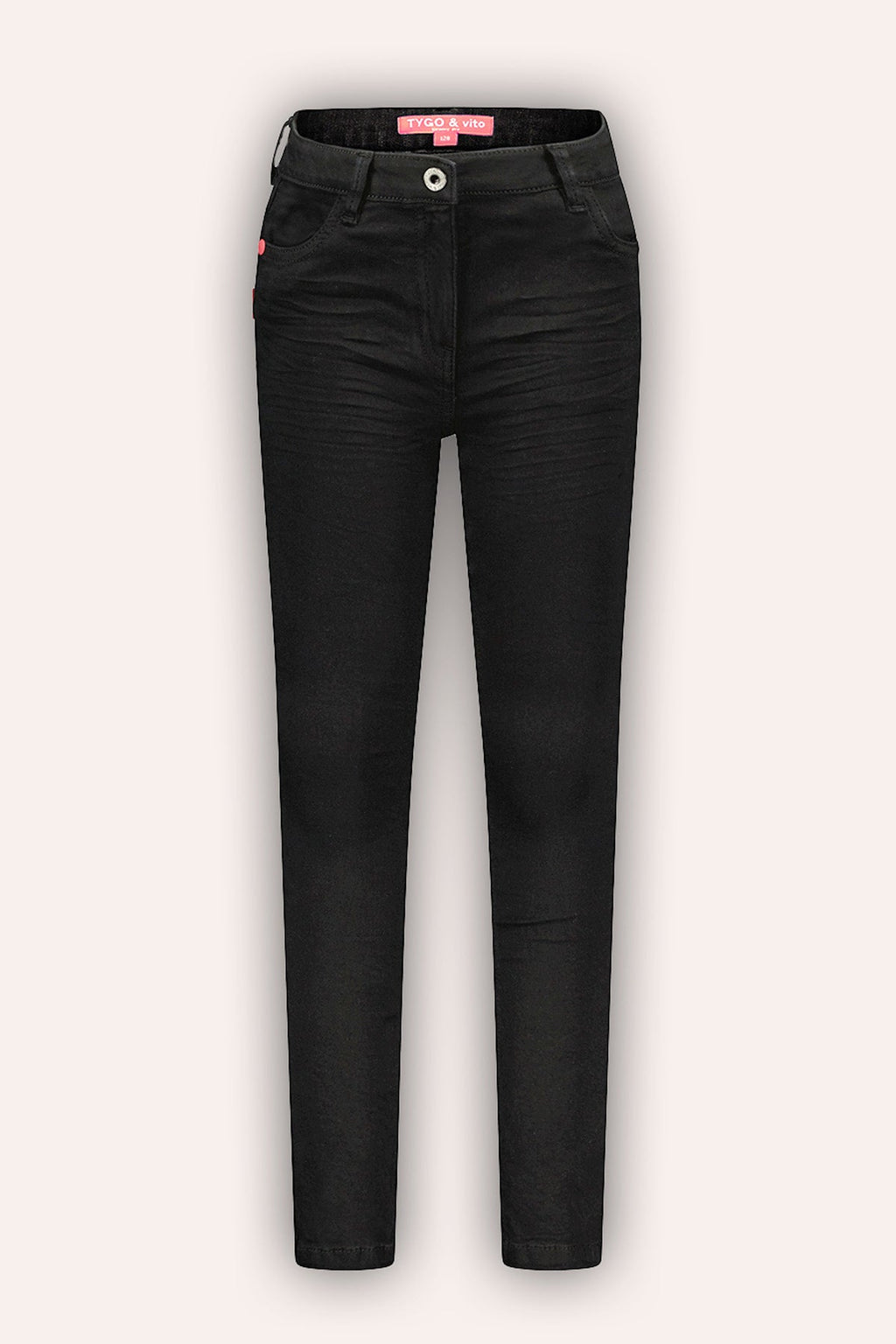 Super stretch skinny fit black denim jeans of tregging voor meisjes in gewassen denim. De broek heeft steekzakken, achterzakken en een verstelbare tailleband. De kleinste maten (92-128) hebben een haak- en ritssluiting en de grootste maten (134-152) hebben een knoop- en ritssluiting. SEE YOU NEXTERDAY.